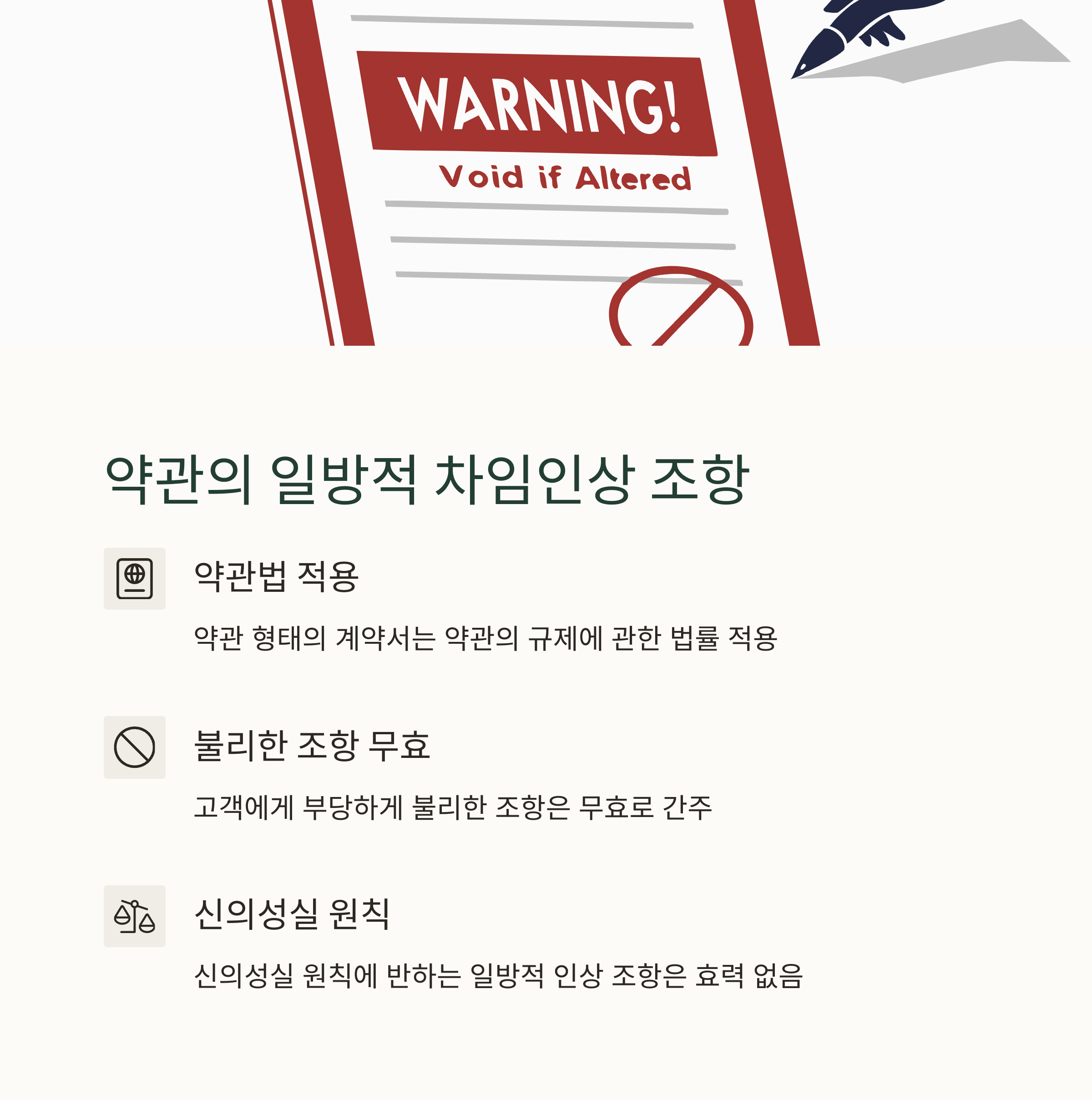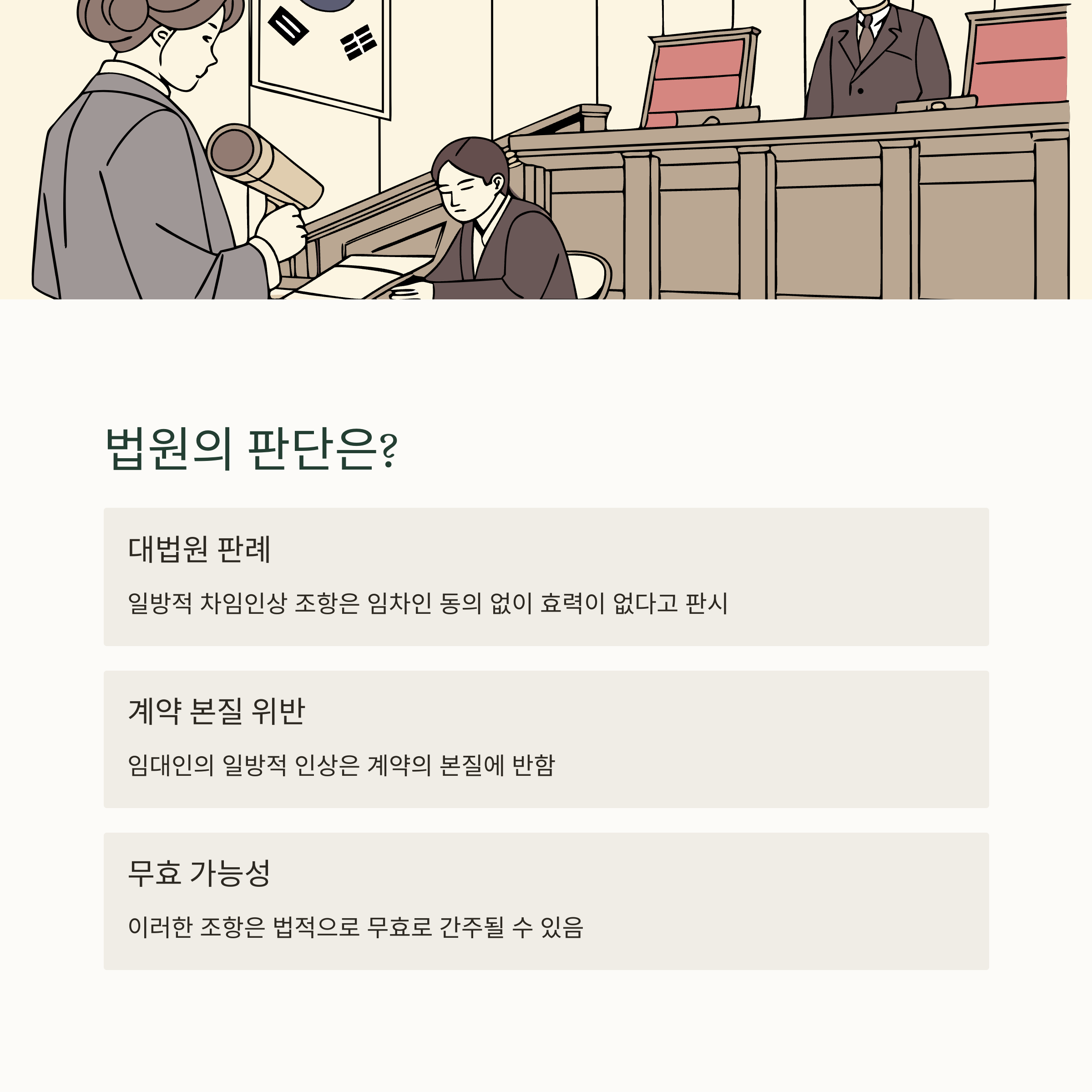 - 약관 형태의 계약서에서는 일방적 차임인상 조항이 무효로 판단될 수 있으므로, 주의가 필요합니다.