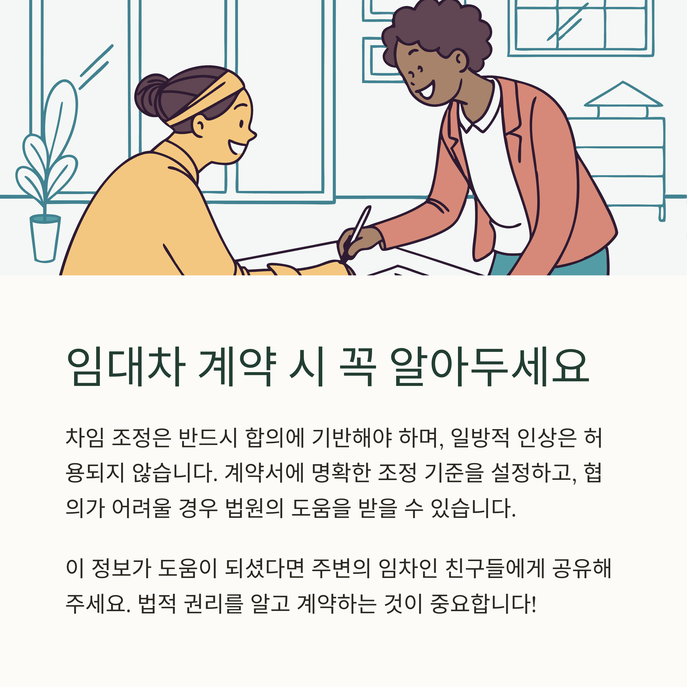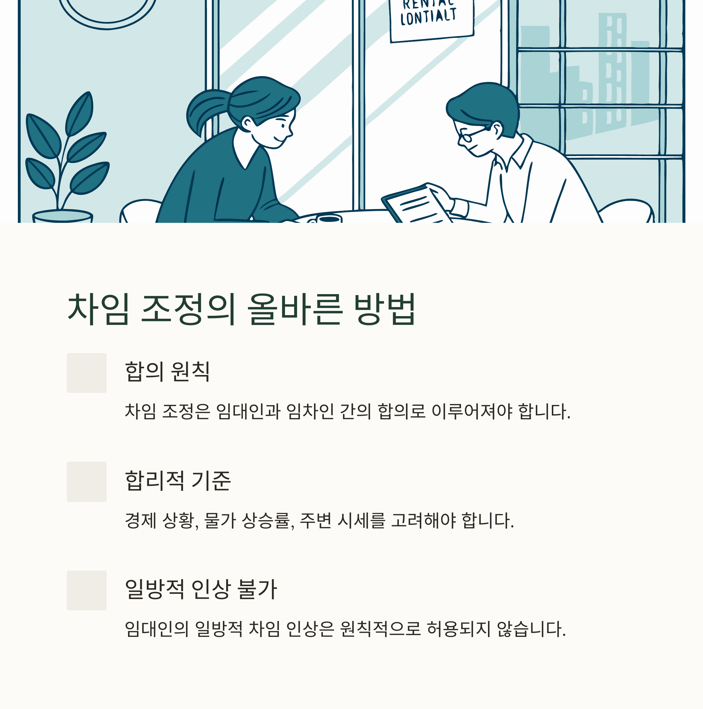 - 차임 조정은 당사자 간의 합의에 기반해야 하며, 일방적인 인상은 원칙적으로 허용되지 않습니다.