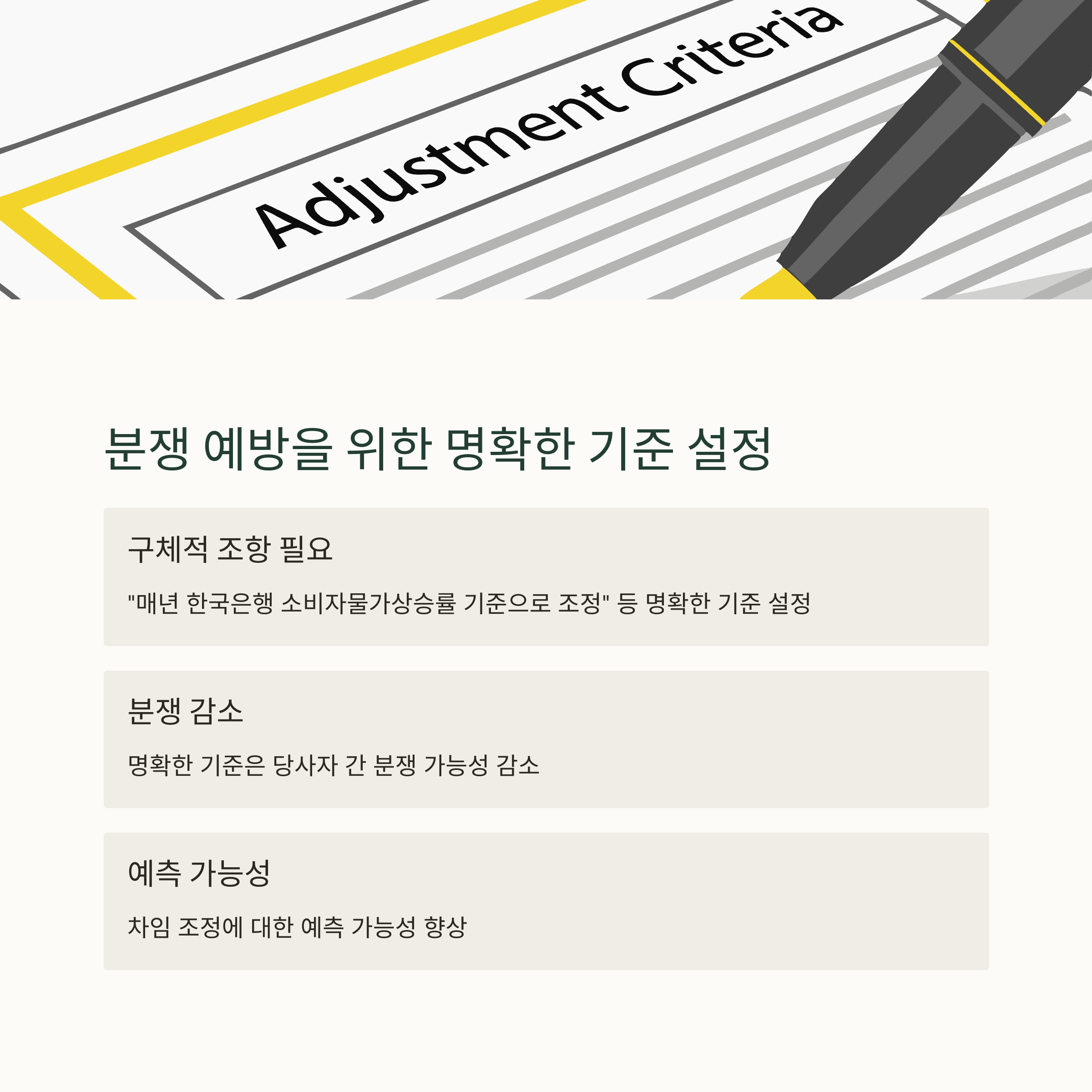 차임 조정에 대한 분쟁을 예방하기 위해서는 계약서에 명확한 조정 기준을 설정하는 것이 중요합니다. 예를 들어, "매년 한국은행이 발표하는 소비자물가상승률을 기준으로 차임을 조정한다"는 식의 구체적인 조항을 포함시키는 것이 바람직합니다. 이러한 명확한 기준은 당사자 간의 분쟁을 줄이고, 차임 조정에 대한 예측 가능성을 높여줍니다.