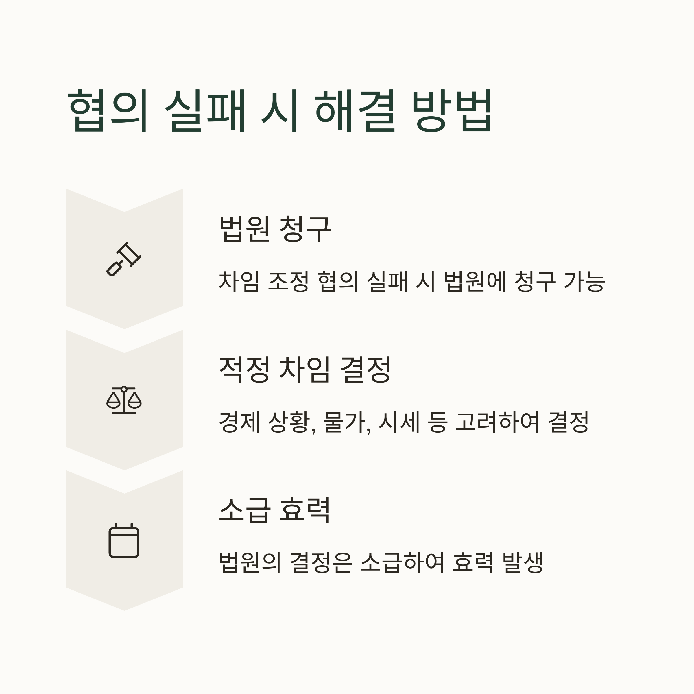 - 차임 조정에 대한 협의가 이루어지지 않을 경우, 법원에 청구하여 적정한 차임을 결정받을 수 있습니다.