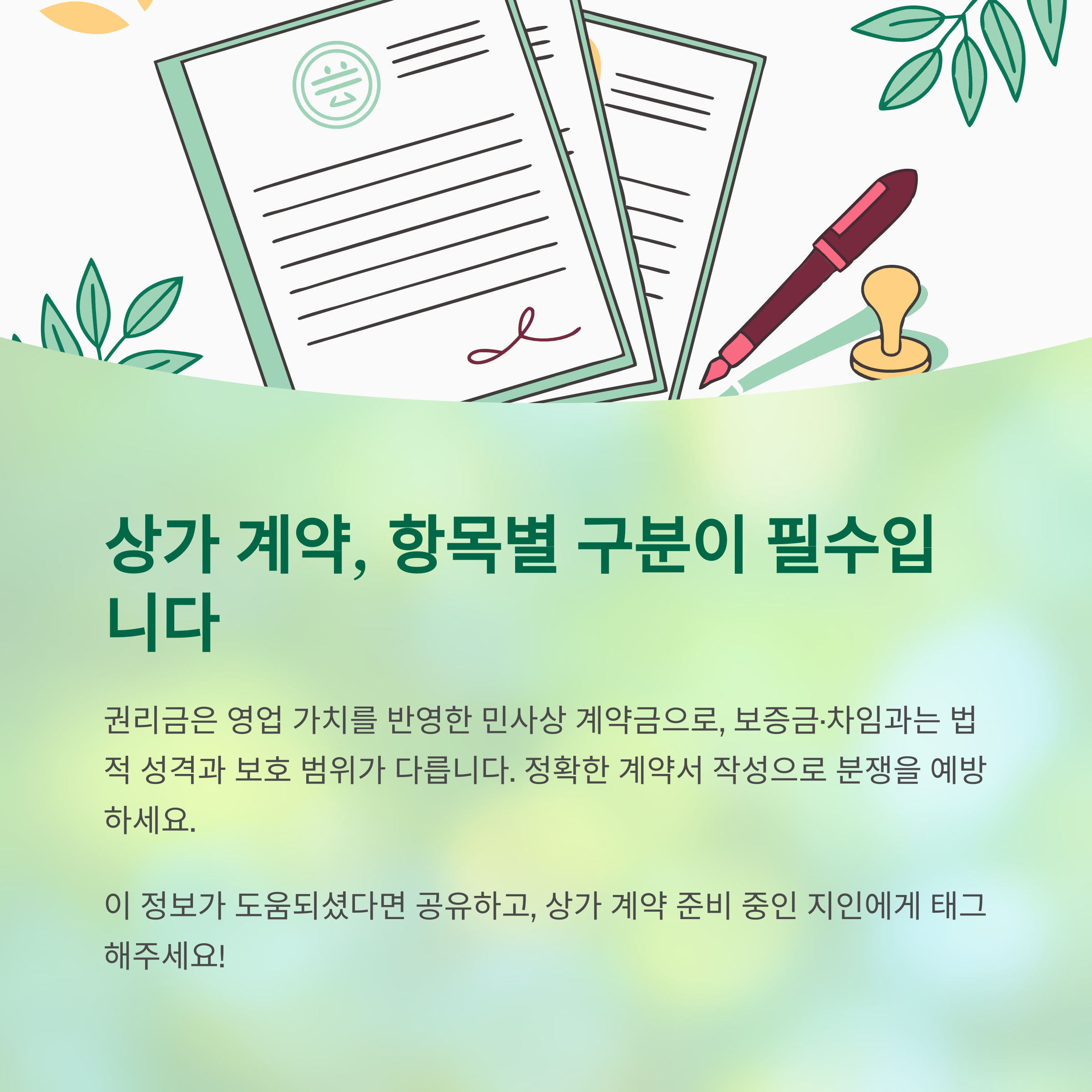 특히 권리금 계약은 별도의 문서와 임대인의 동의를 확보하는 것이 중요합니다.