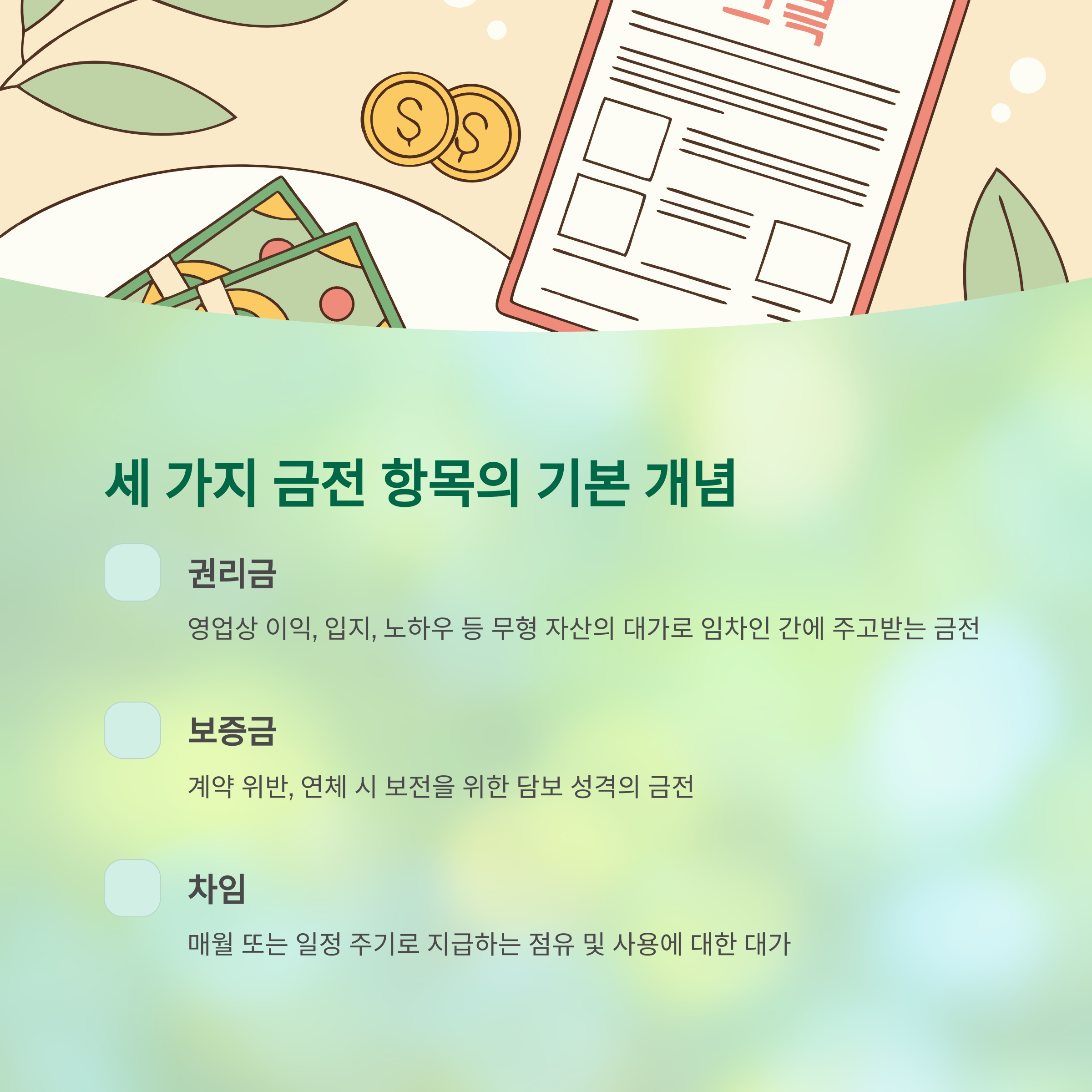 상가 임대차 계약에서는 다음 세 가지 주요 금전 항목이 존재합니다.