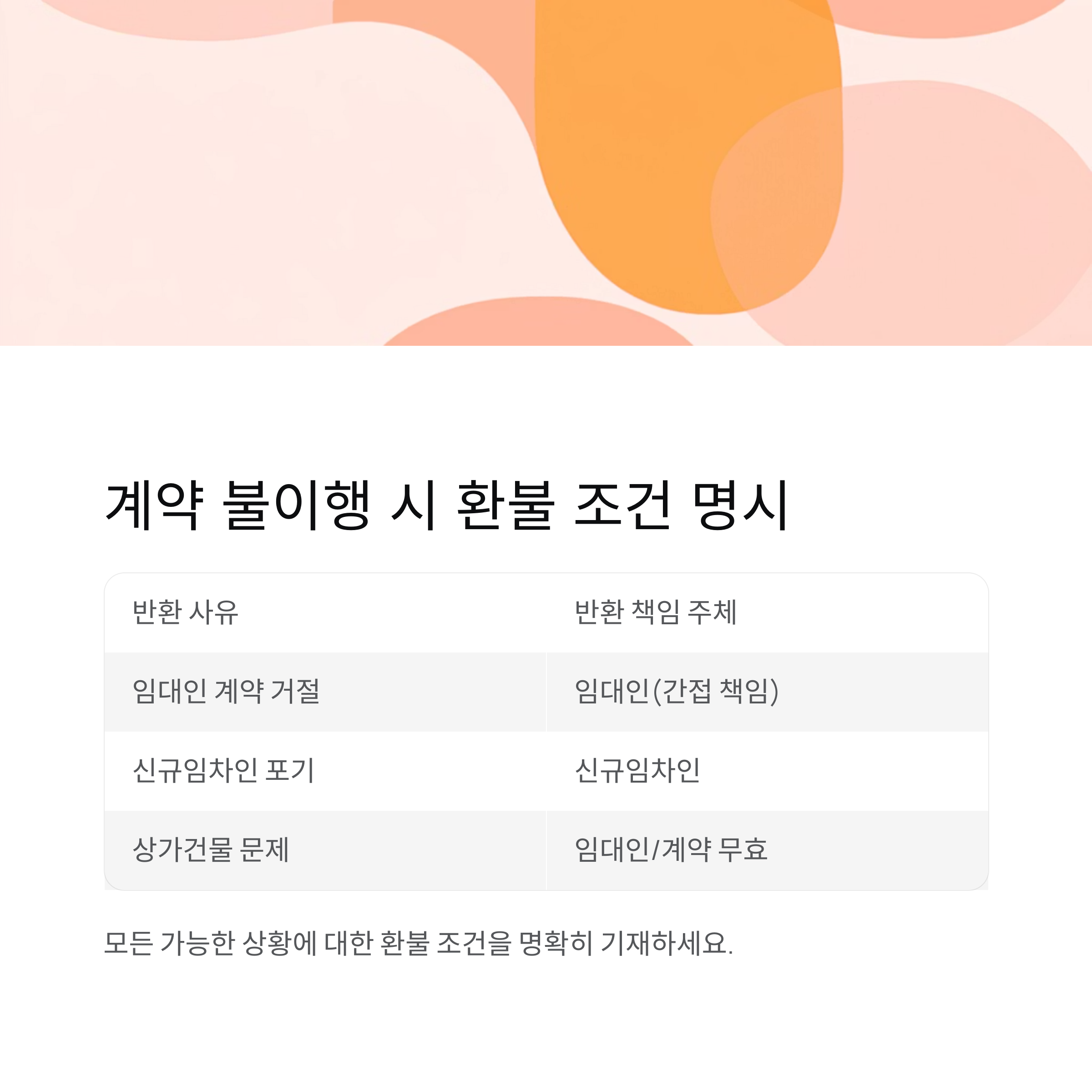 | 상가건물 문제(재건축 등) | 임대인 또는 계약 무효 | 전액 환불 조항 필요 |
