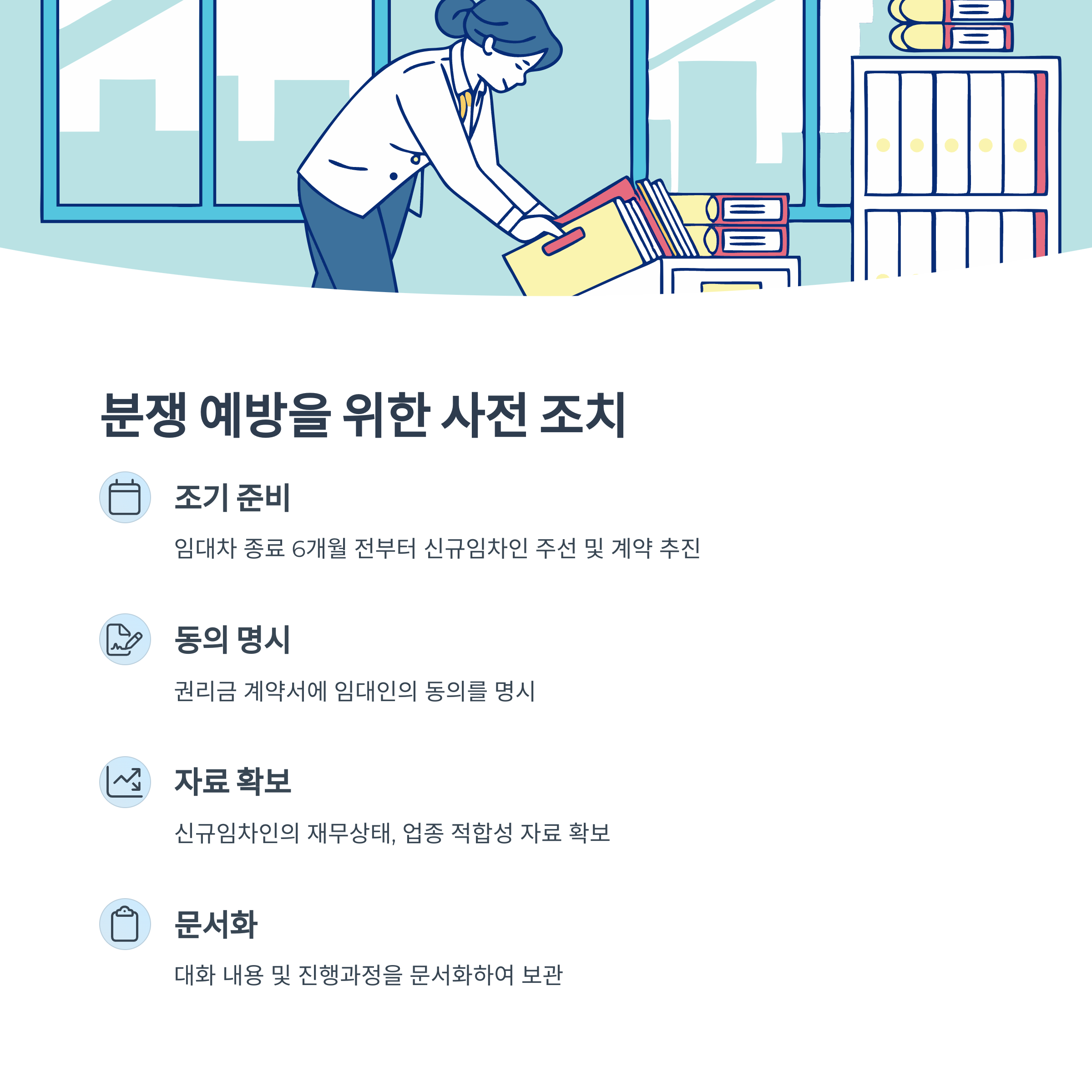 - 임대차 종료 6개월 전부터 신규임차인 주선 및 계약 추진