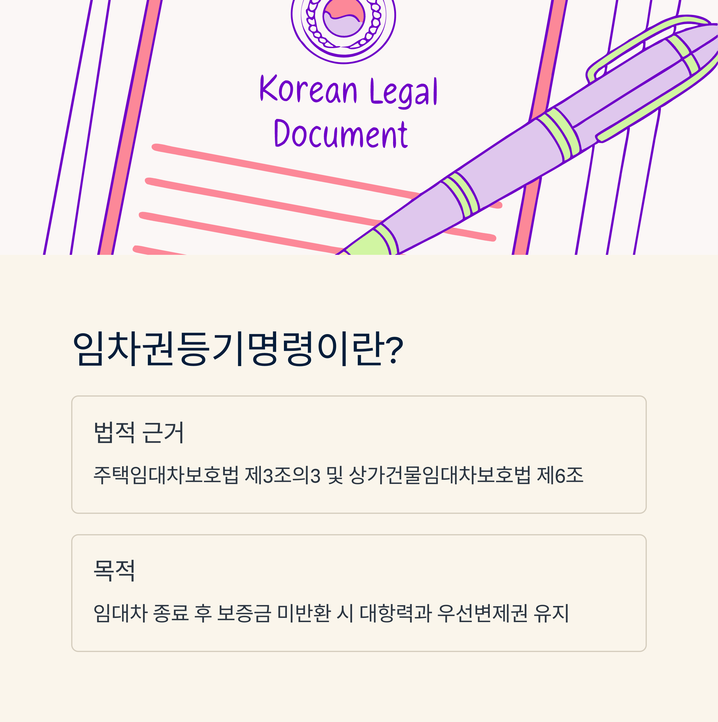 임차권등기명령은 임대차계약이 종료된 후 보증금을 반환받지 못한 임차인이 법원에 신청하여 등기부에 임차권을 기재함으로써 대항력과 우선변제권을 유지할 수 있도록 하는 제도입니다. 이 제도는 주택임대차보호법 제3조의3 및 상가건물임대차보호법 제6조에 근거를 두고 있습니다.