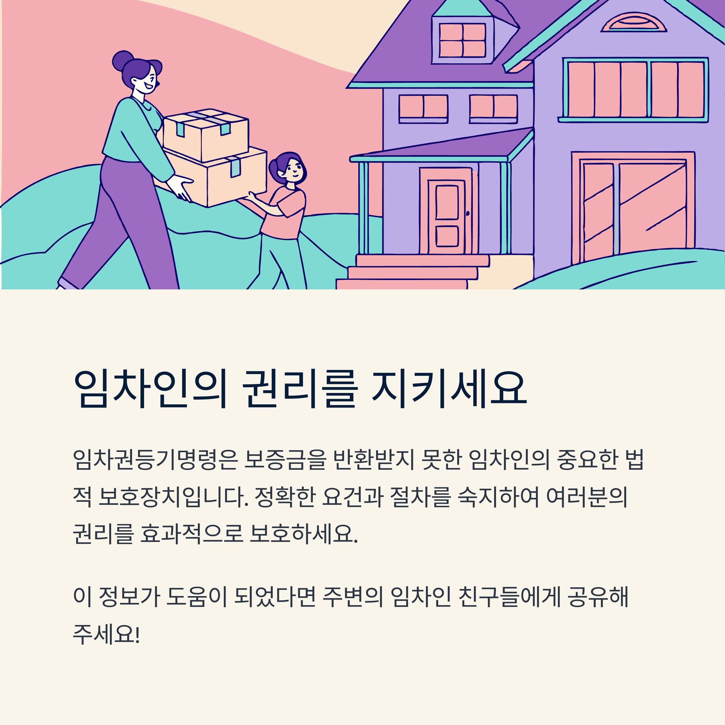 - 보증금 반환을 위한 추가 조치: 임차권등기명령은 보증금 반환을 위한 절차 중 하나이며, 필요 시 소송 등 추가 조치를 고려해야 합니다.