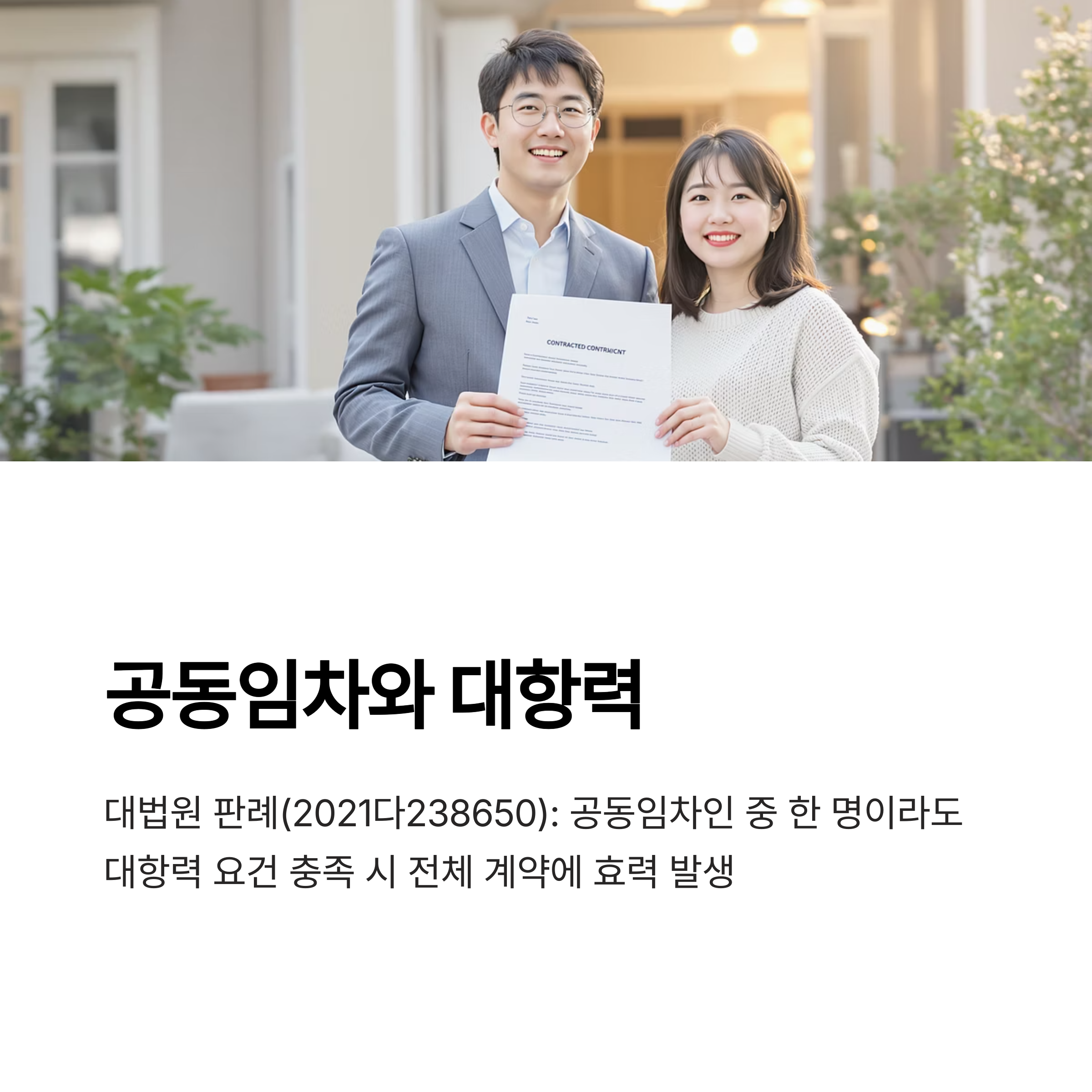 대법원 판례(2021다238650)에 따르면, 공동임차인 중 한 명이라도 대항력 요건을 충족하면 전체 계약에 효력이 발생합니다.