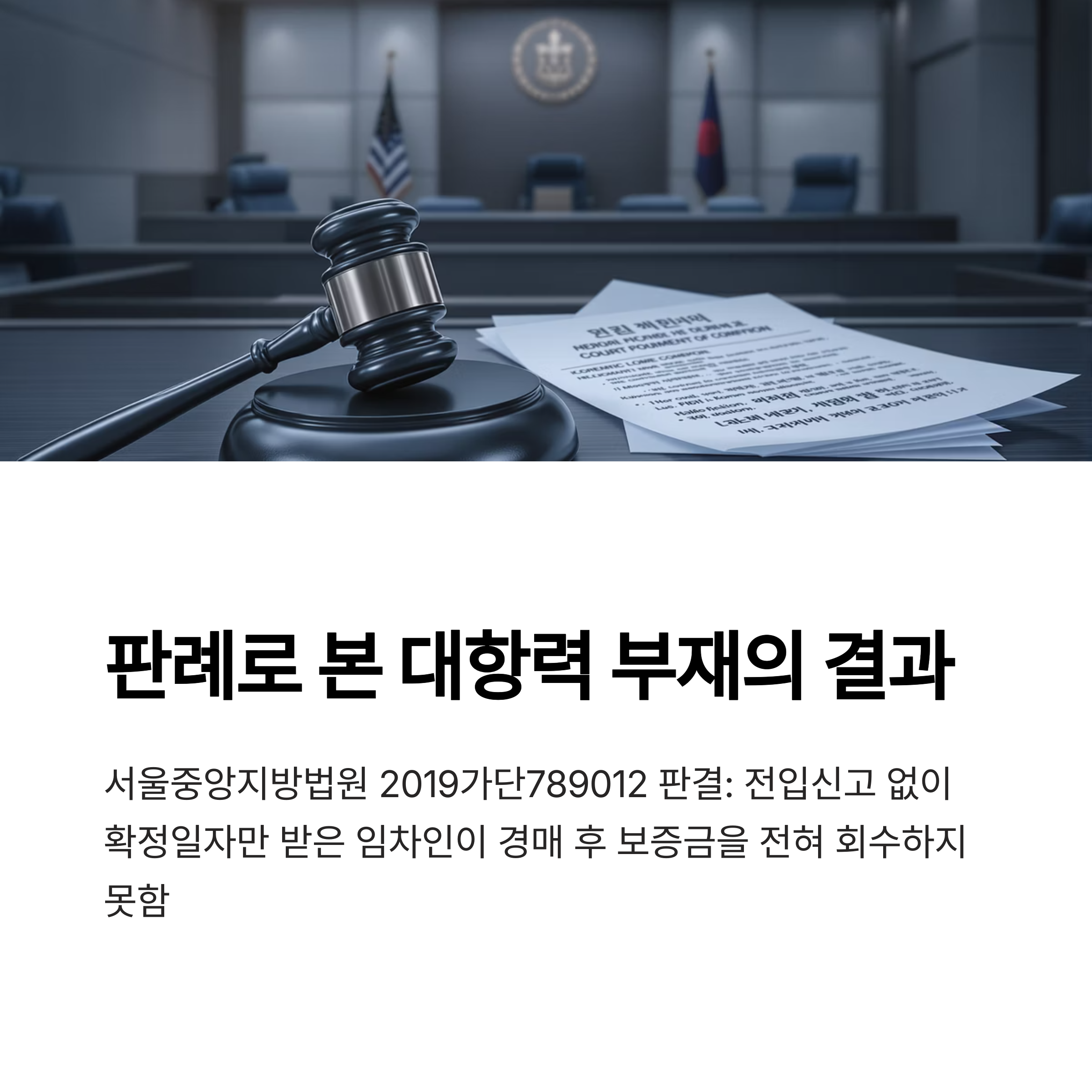 서울중앙지방법원 2019가단789012 판결에서는 대항력을 확보하지 못한 임차인이 주택 경매 후 보증금을 전혀 돌려받지 못한 사례가 있습니다.