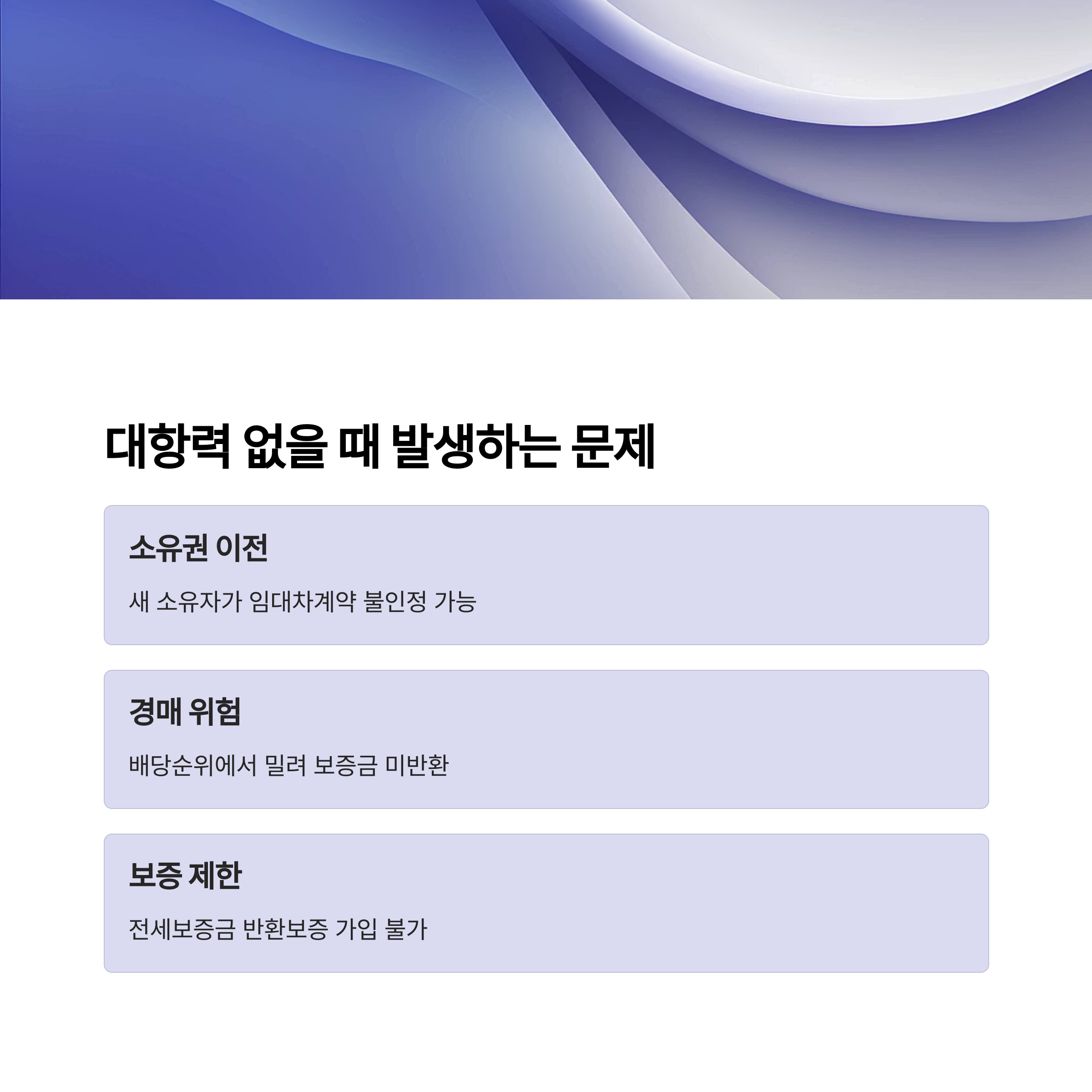 - 주택이 제3자에게 소유권이 이전될 경우, 새 소유자가 임대차계약을 인정하지 않을 수 있습니다.