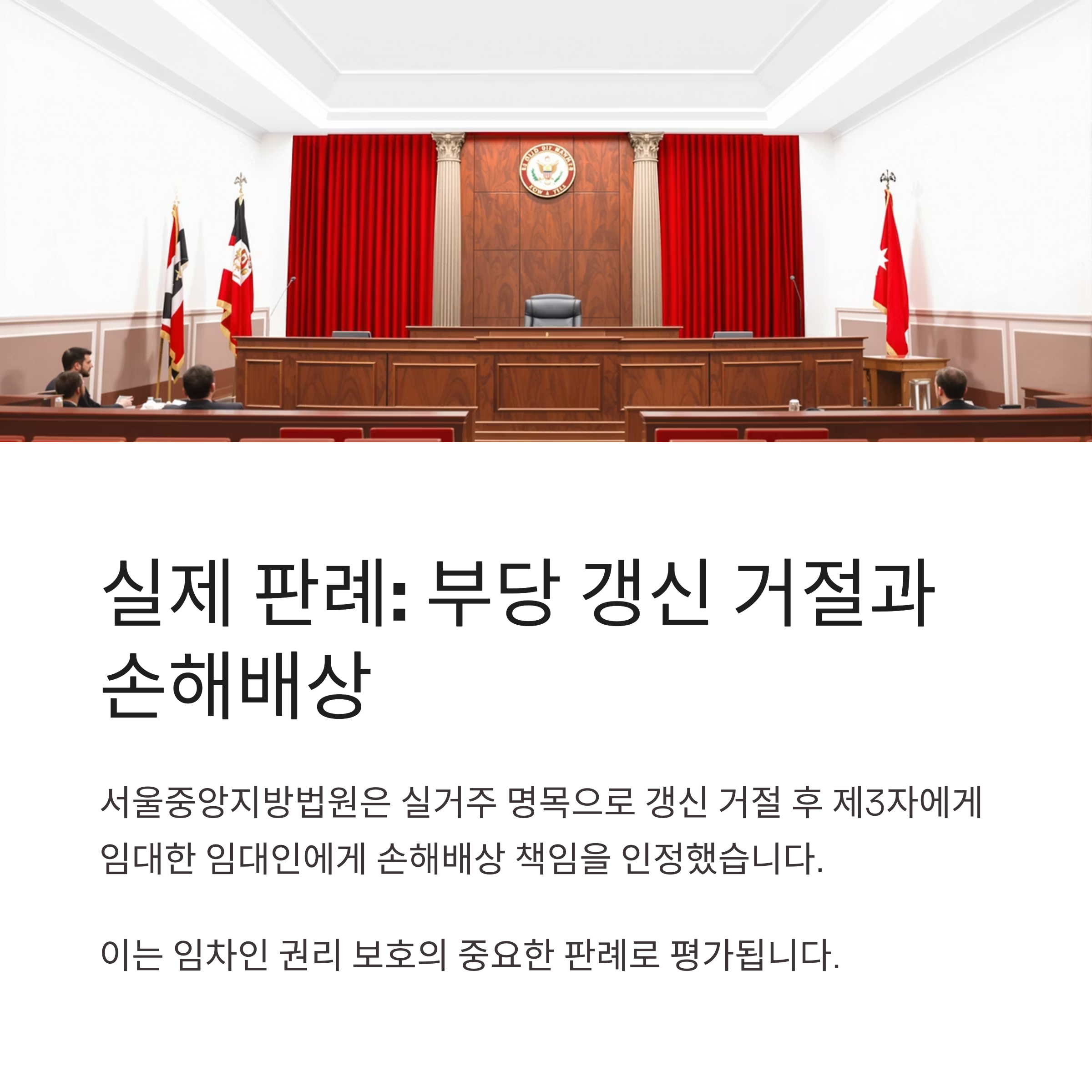 서울중앙지방법원은 임대인이 실거주를 이유로 갱신을 거절한 후, 해당 주택을 제3자에게 임대한 경우, 임차인에게 손해배상 책임이 있다고 판결하였습니다. 이는 임대인의 갱신 거절 사유가 정당하지 않다고 본 사례로, 임차인의 권리 보호에 중요한 판례로 평가됩니다.