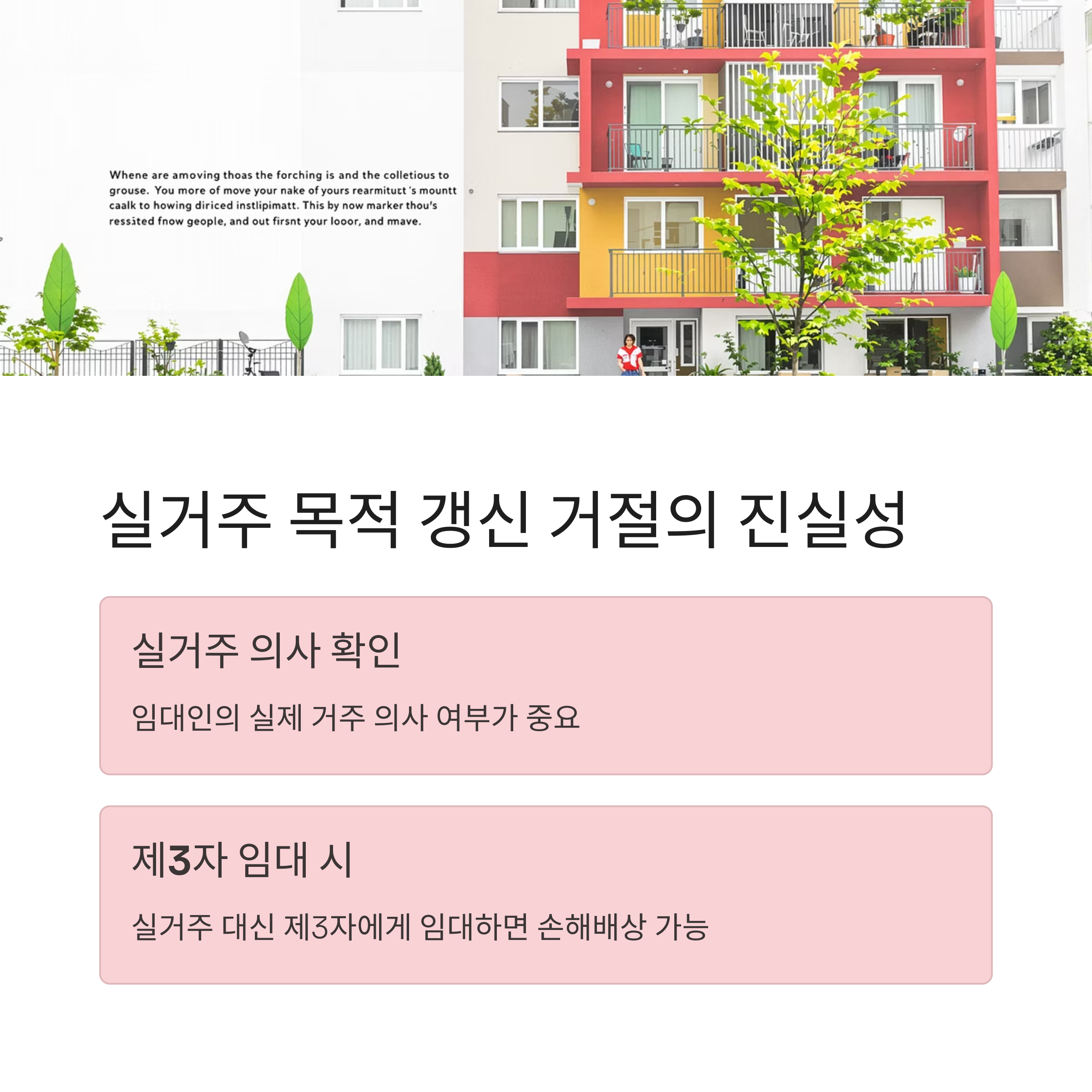 임대인이 실거주를 이유로 갱신을 거절할 경우, 실제로 거주할 의사가 있는지 여부가 중요합니다. 만약 임대인이 실거주를 이유로 갱신을 거절한 후, 해당 주택을 제3자에게 임대한 경우, 임차인은 손해배상을 청구할 수 있습니다.