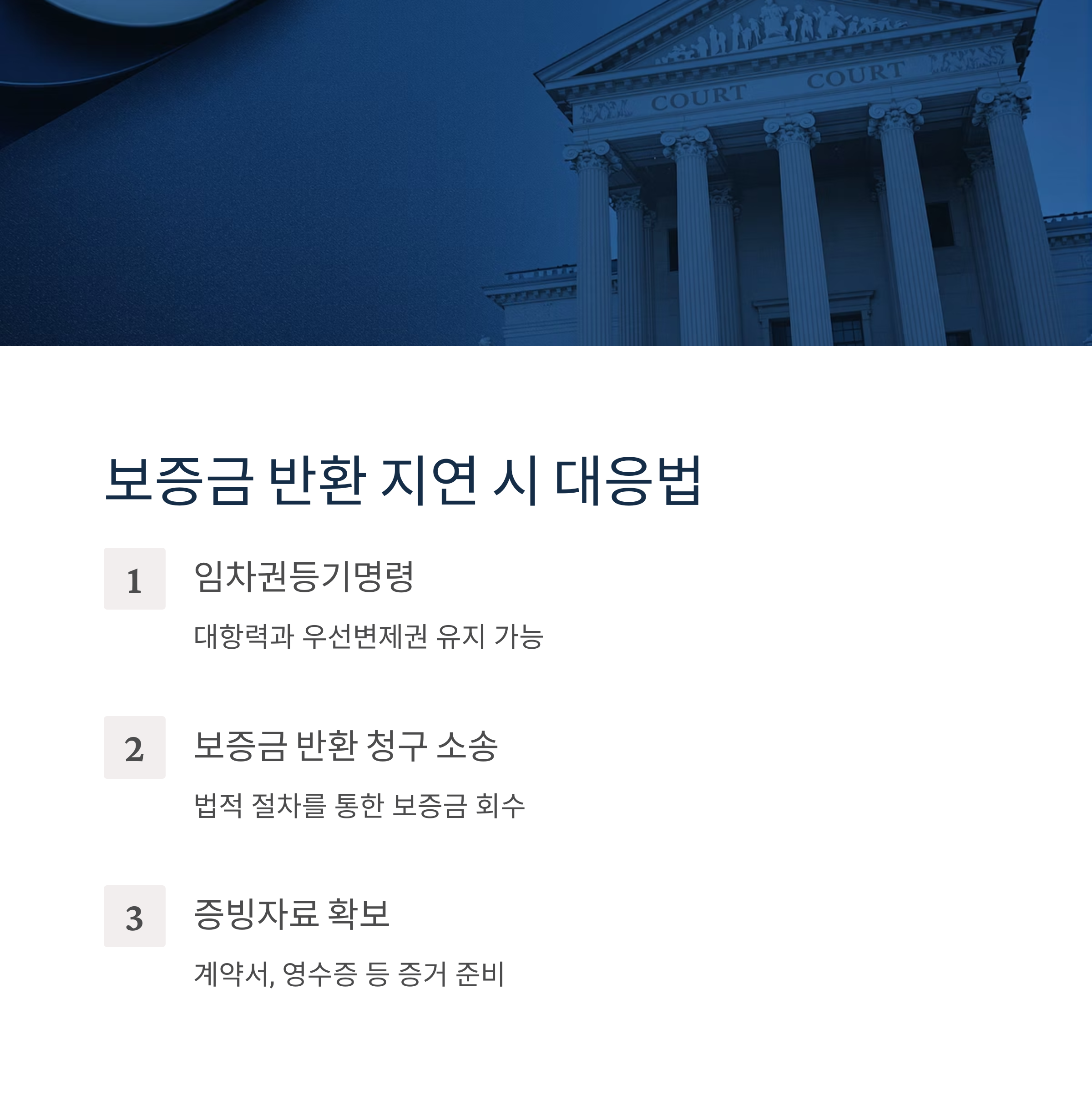 보증금 반환이 지연되거나 거부되는 경우, 임차인은 법적 조치를 검토할 수 있습니다. 임차권등기명령 외에도 보증금 반환 청구 소송을 제기하거나, 지급명령 등을 활용할 수 있습니다. 계약 내용과 반환 약정일 등을 명확히 증빙할 수 있는 자료 확보가 중요합니다.