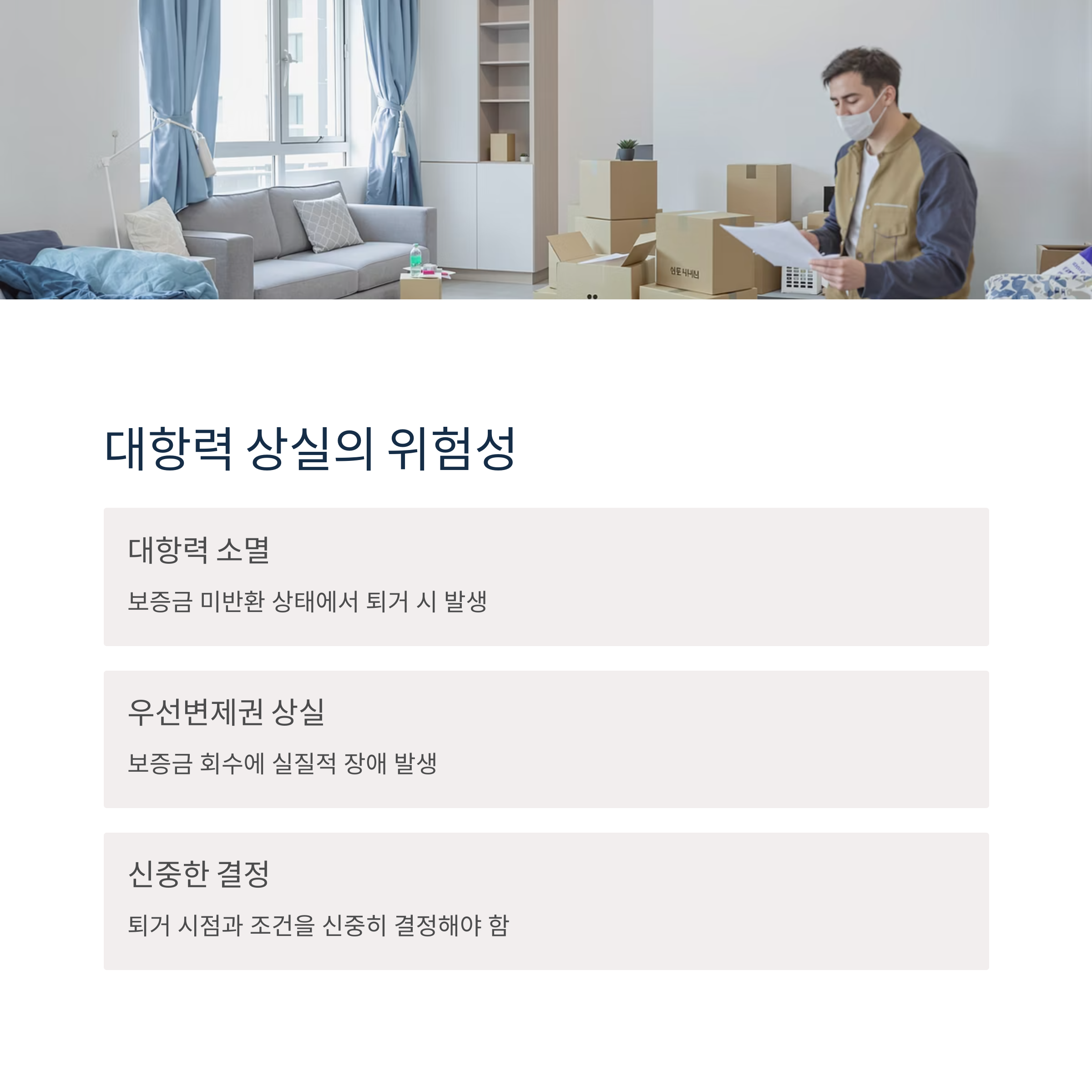 임차인이 보증금을 반환받지 못한 상태에서 퇴거하면, 대항력과 우선변제권이 소멸됩니다. 이로 인해 제3자에게 보증금을 청구하기 어렵게 되어, 보증금 회수에 실질적인 장애가 발생할 수 있습니다. 계약 종료 후에도 권리 보호를 위해 퇴거 시점과 조건을 신중히 결정해야 합니다.