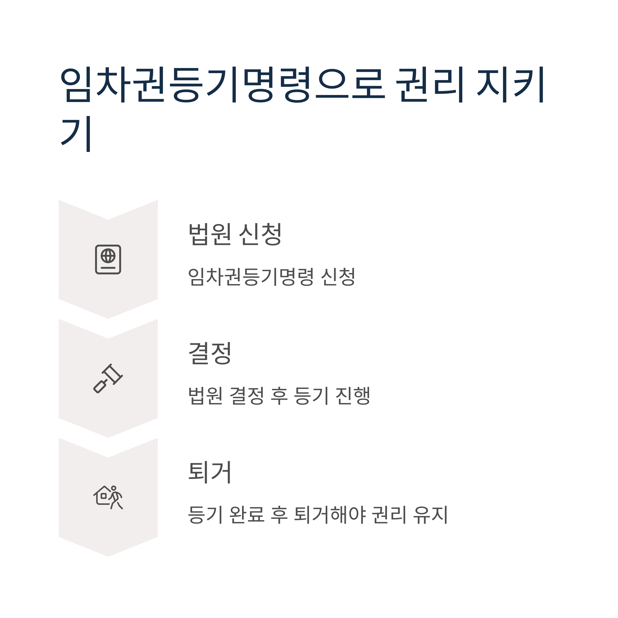 보증금을 반환받지 못한 임차인은 임차권등기명령을 통해 대항력과 우선변제권을 유지할 수 있습니다. 임차권등기명령은 법원에 신청하여 결정이 내려지면, 등기를 통해 임차인의 권리를 제3자에게 주장할 수 있습니다. 단, 등기 완료 전 퇴거할 경우 기존 대항력은 소멸되므로, 등기 완료 후 퇴거해야 합니다.