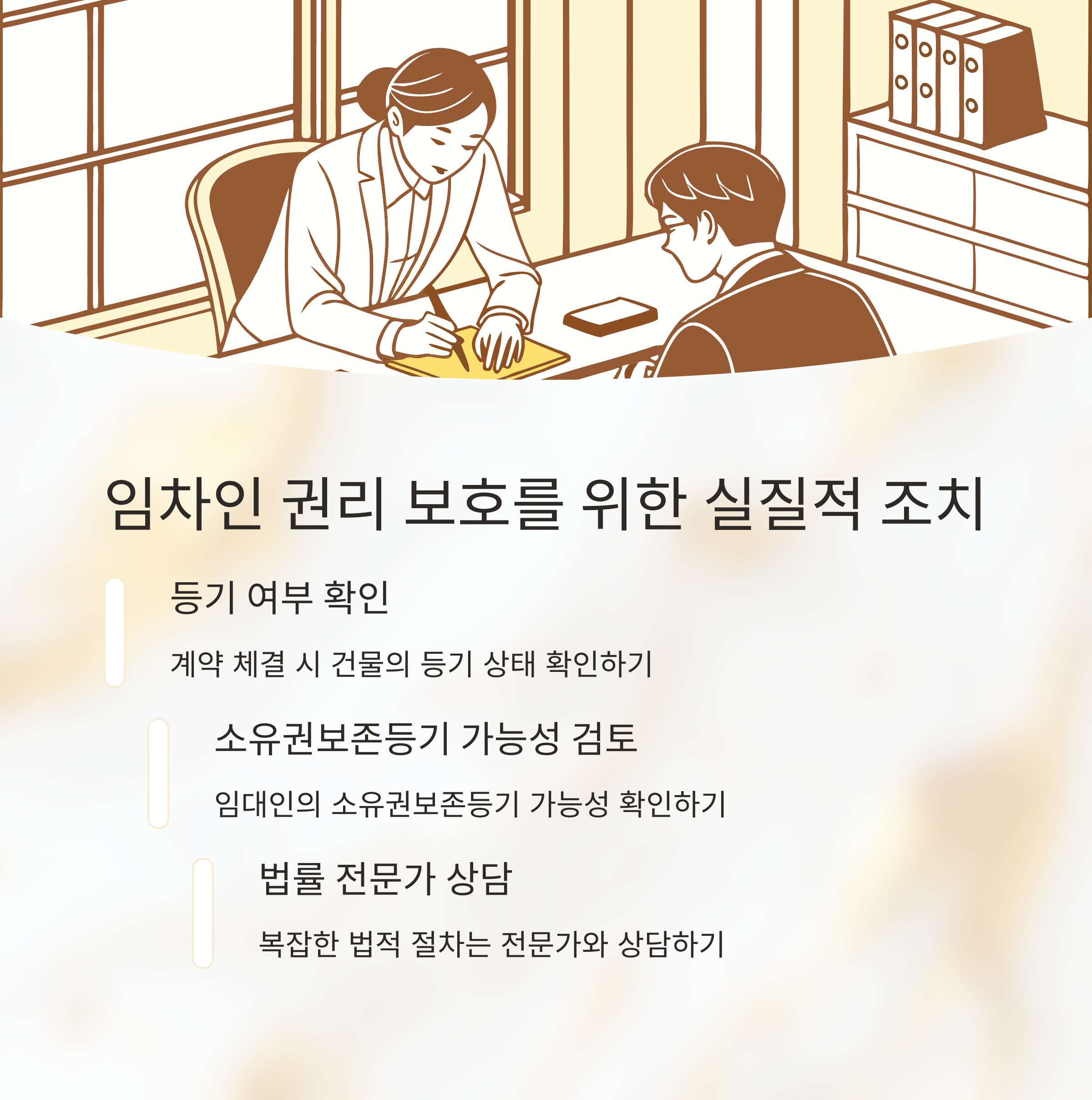 무허가 건물의 임차인이 보증금을 보호받기 위해서는 다음과 같은 실질적인 조치를 취하는 것이 중요합니다: