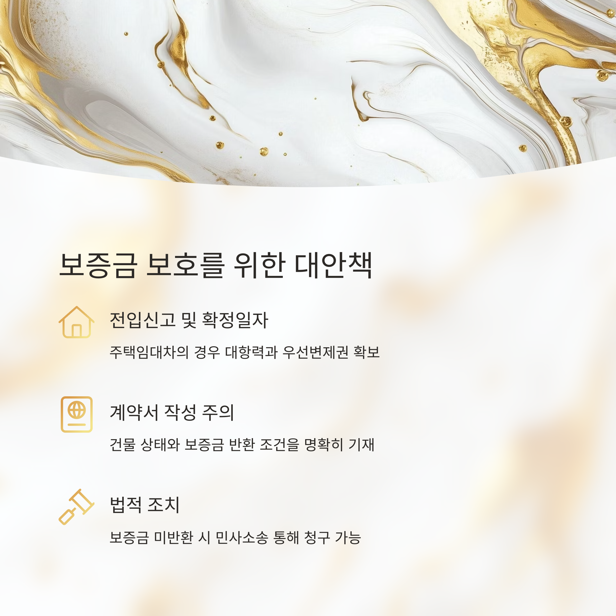- 임대차계약서 작성 시 주의사항: 임대차계약서에 건물의 상태와 보증금 반환 조건 등을 명확히 기재하여 분쟁 발생 시 증거로 활용할 수 있도록 합니다.