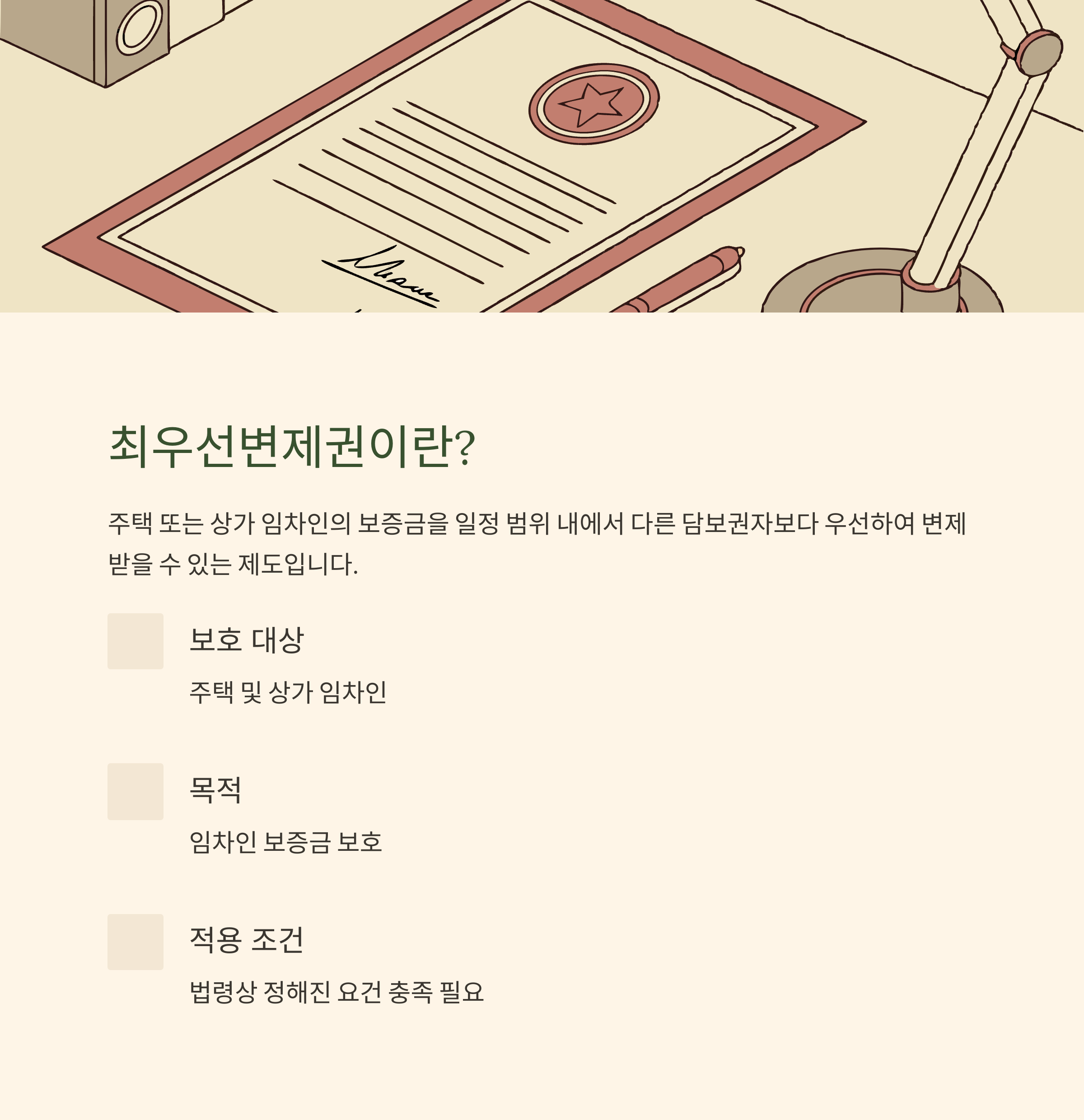 최우선변제권은 주택 또는 상가 임차인의 보증금을 일정 범위 내에서 다른 담보권자보다 우선하여 변제받을 수 있도록 보호하는 제도입니다. 그러나 법령상 정해진 요건을 충족하지 못하는 경우, 해당 권리가 적용되지 않습니다. 이 글에서는 주택임대차보호법과 상가건물임대차보호법을 중심으로 최우선변제권이 배제되는 주요 사례와 조건을 정리합니다.