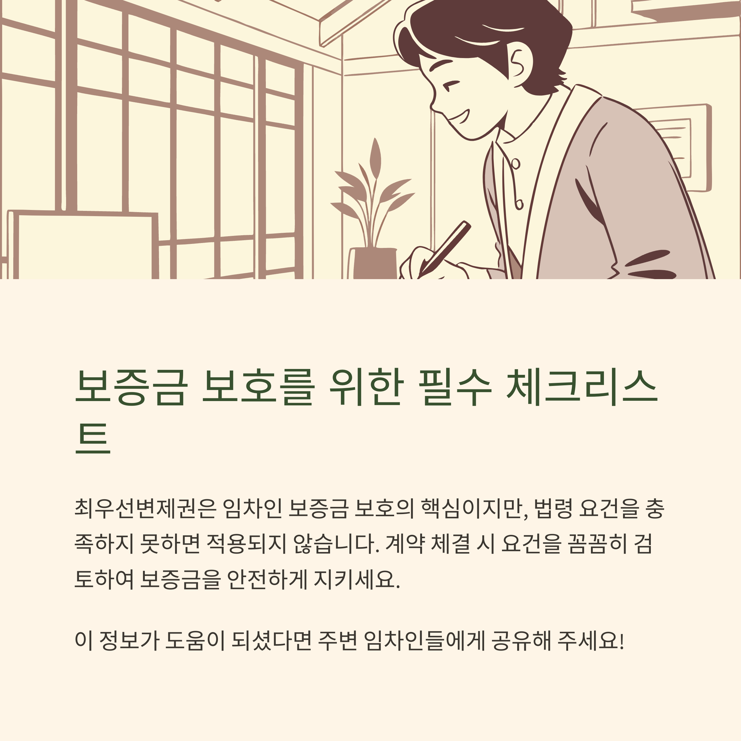 최우선변제권은 임차인의 보증금을 보호하기 위한 중요한 제도이지만, 법령에서 정한 요건을 충족하지 못하는 경우에는 적용되지 않습니다. 임차인은 계약 체결 시 이러한 요건을 충분히 검토하여 보증금 보호에 만전을 기해야 합니다.
