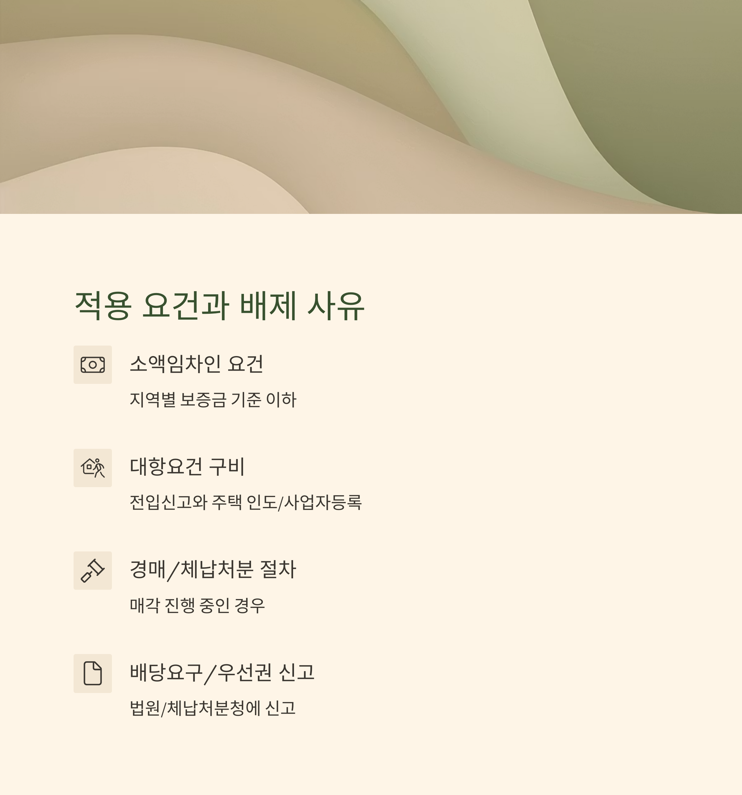 - 소액임차인 요건 충족: 지역별로 정해진 보증금 기준 이하의 임차인