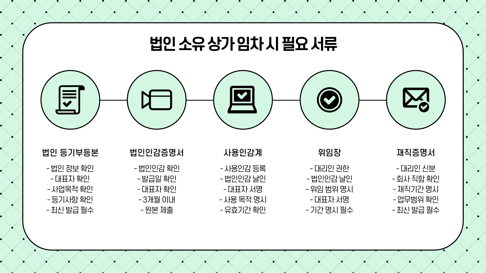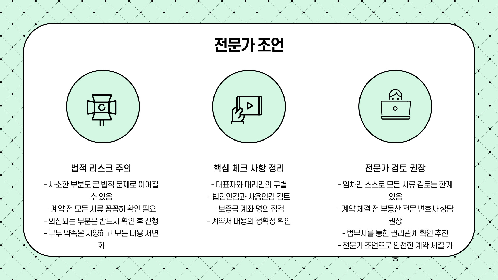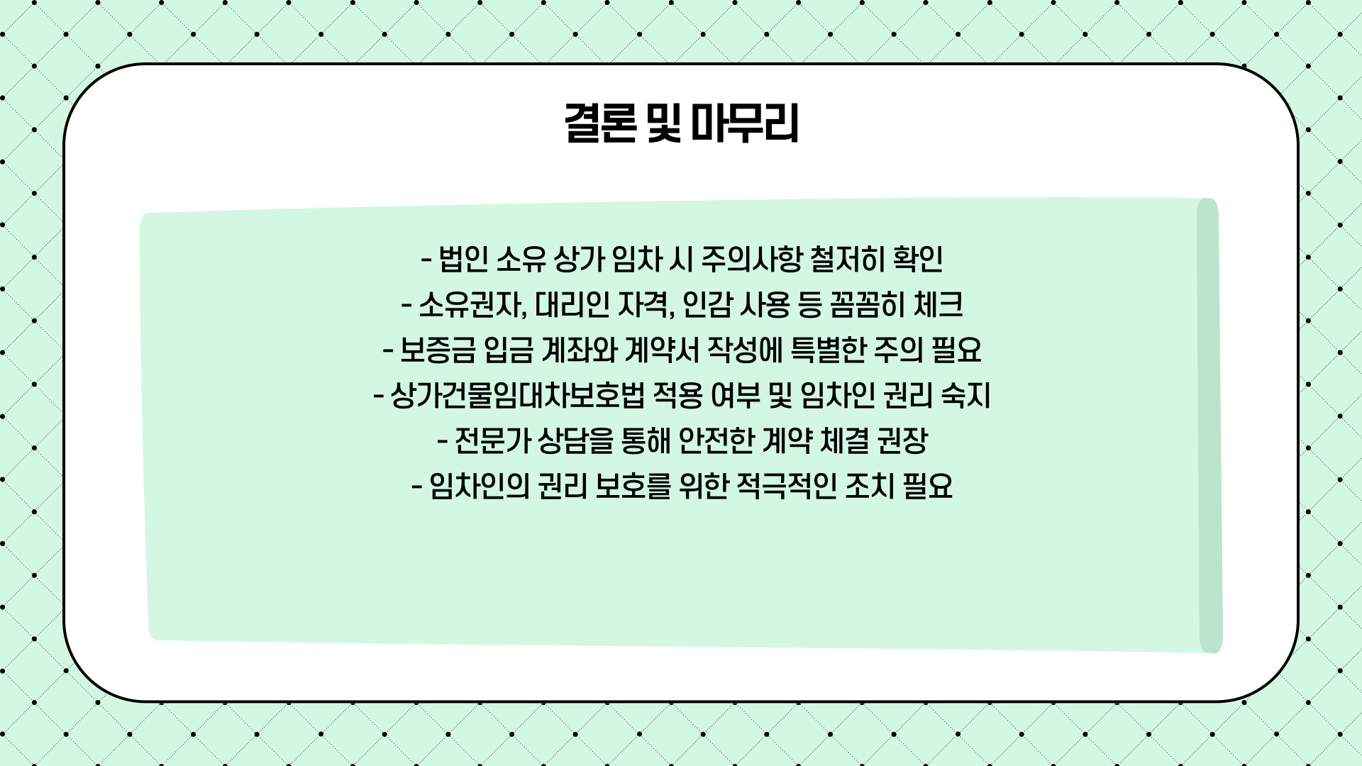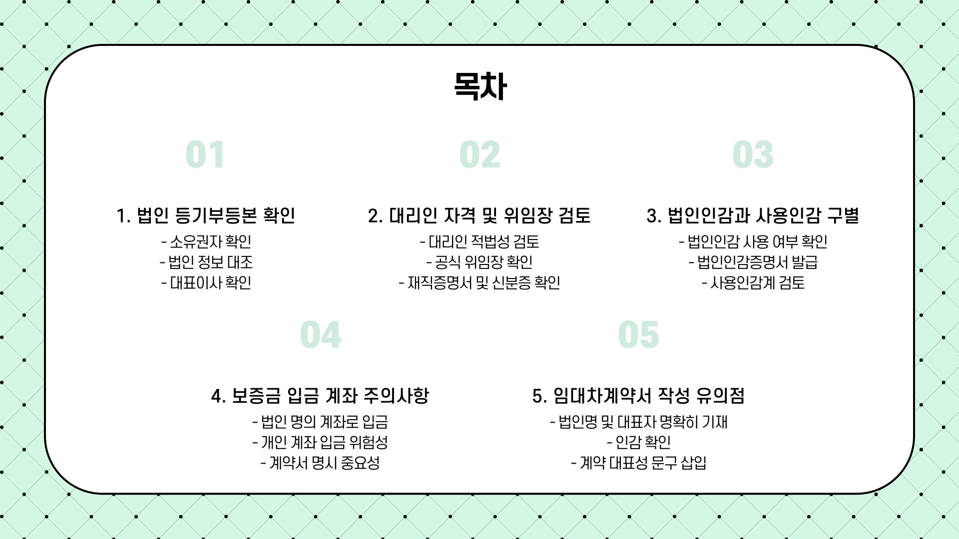 특히, 대표자와 대리인의 구별, 법인인감과 사용인감 검토, 보증금 계좌 명의 점검은 반드시 실무상 체크해야 할 핵심 사항입니다.