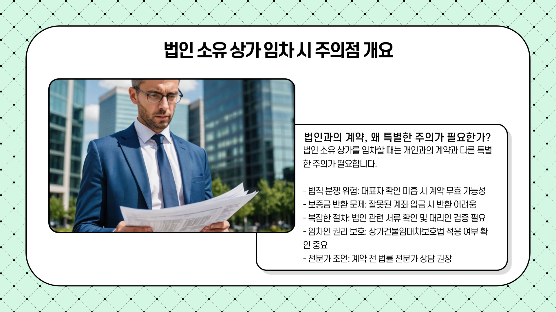 법인이 소유한 상가와 임대차계약을 체결할 때는, 사소한 부분을 놓치더라도 큰 법적 리스크로 이어질 수 있습니다.
