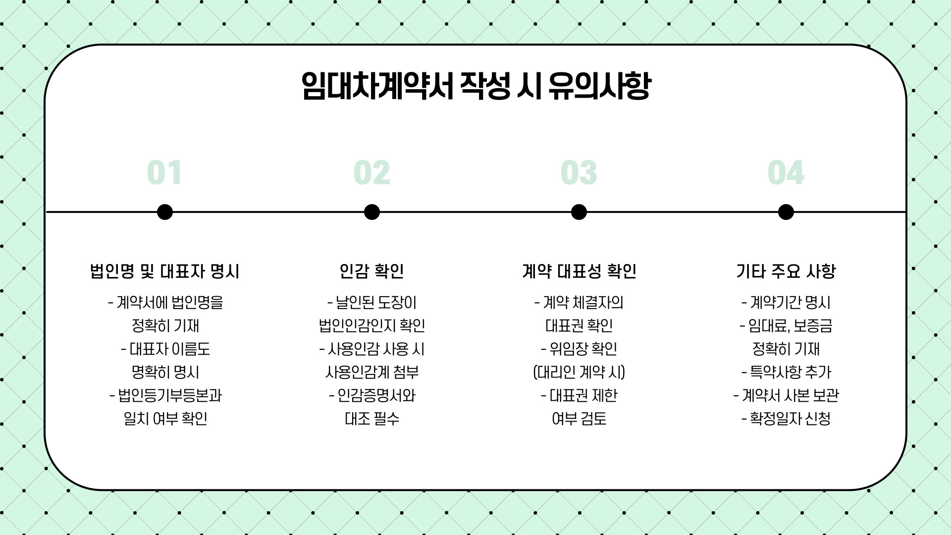 - 계약서에는 법인명, 대표자 이름을 명확히 기재해야 합니다.