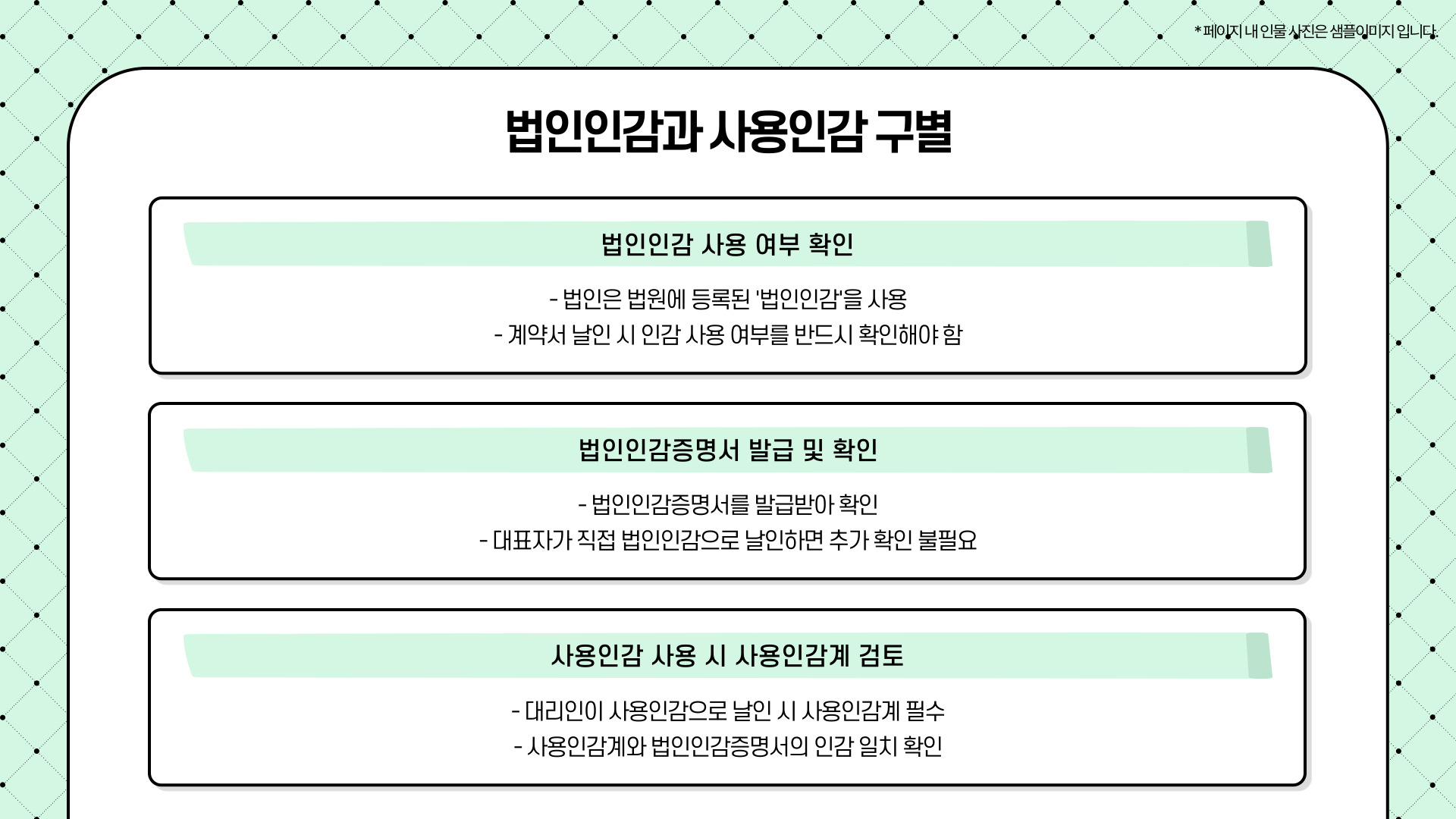 - 대표자가 직접 법인인감으로 날인하면 추가 확인이 필요 없습니다.