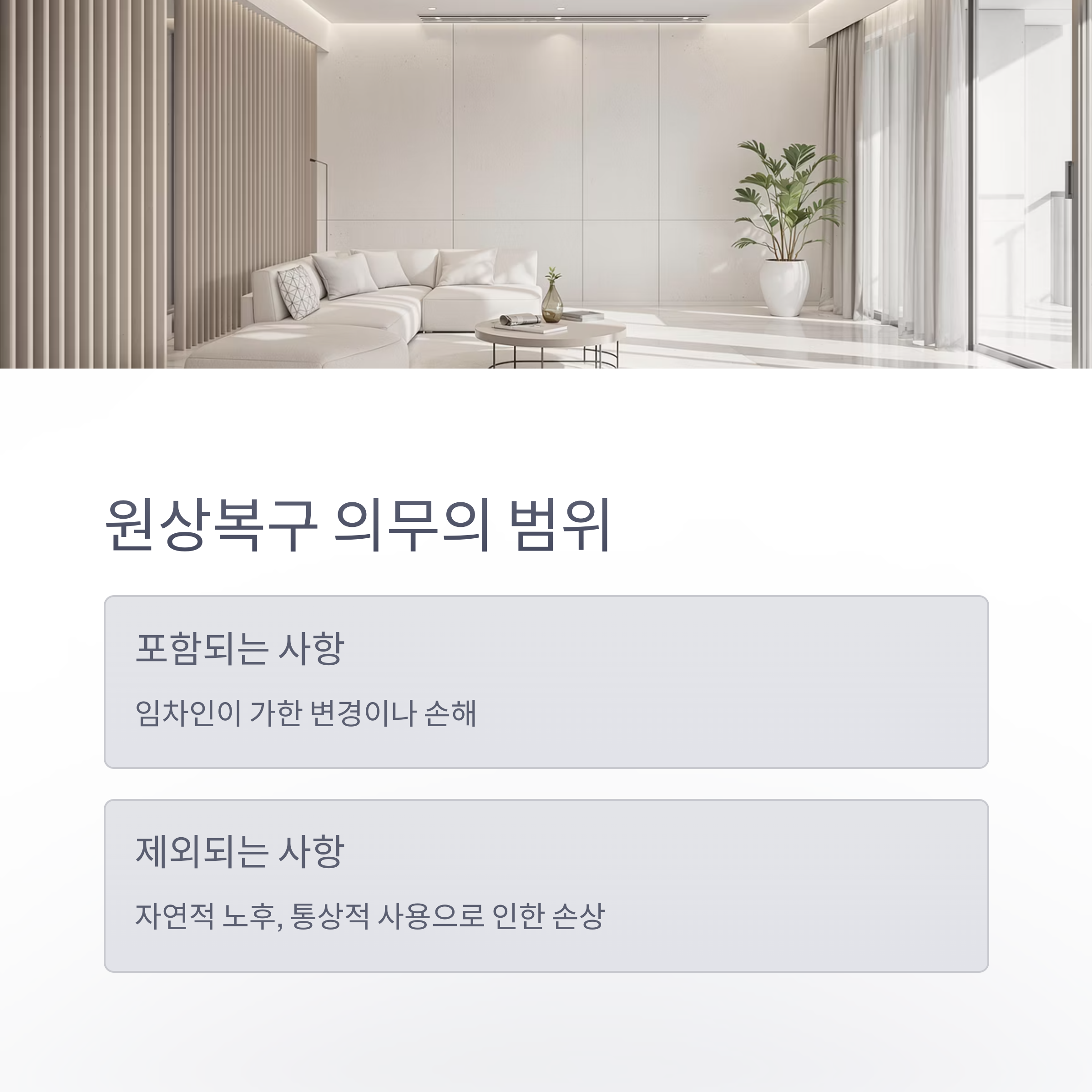 원상복구 의무는 임차인이 임대차 기간 동안 임차목적물에 가한 변경이나 손해를 원래 상태로 되돌리는 것을 의미합니다. 그러나 자연적인 노후나 통상적인 사용으로 인한 손상은 원상복구 의무에 포함되지 않습니다. 예를 들어, 벽지의 자연변색이나 바닥의 마모 등은 임차인의 원상복구 대상이 아닙니다.