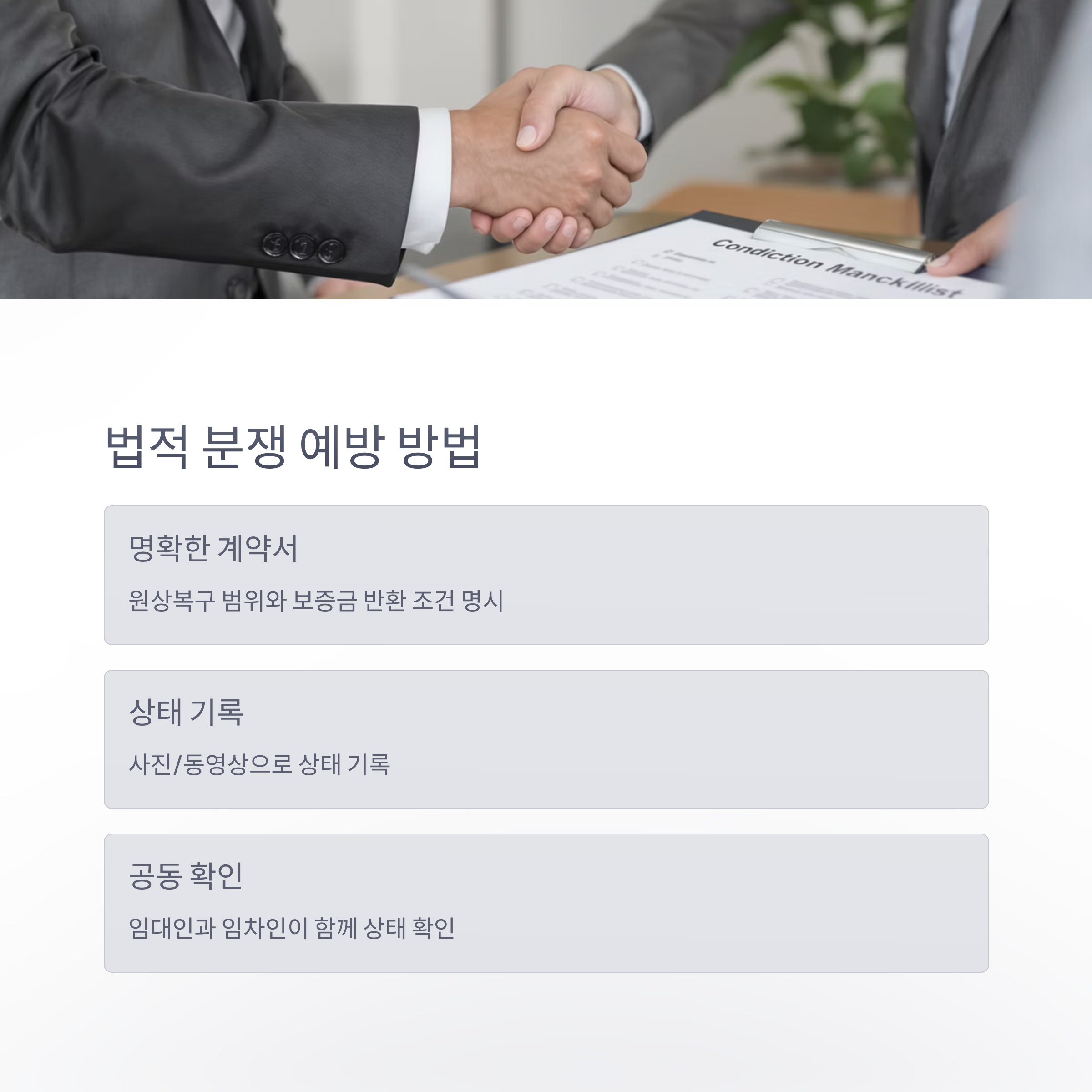 | 분쟁 예방 방법 | 계약서 특약사항 명시, 상태 기록 | 계약서 특약사항 명시, 상태 기록 |