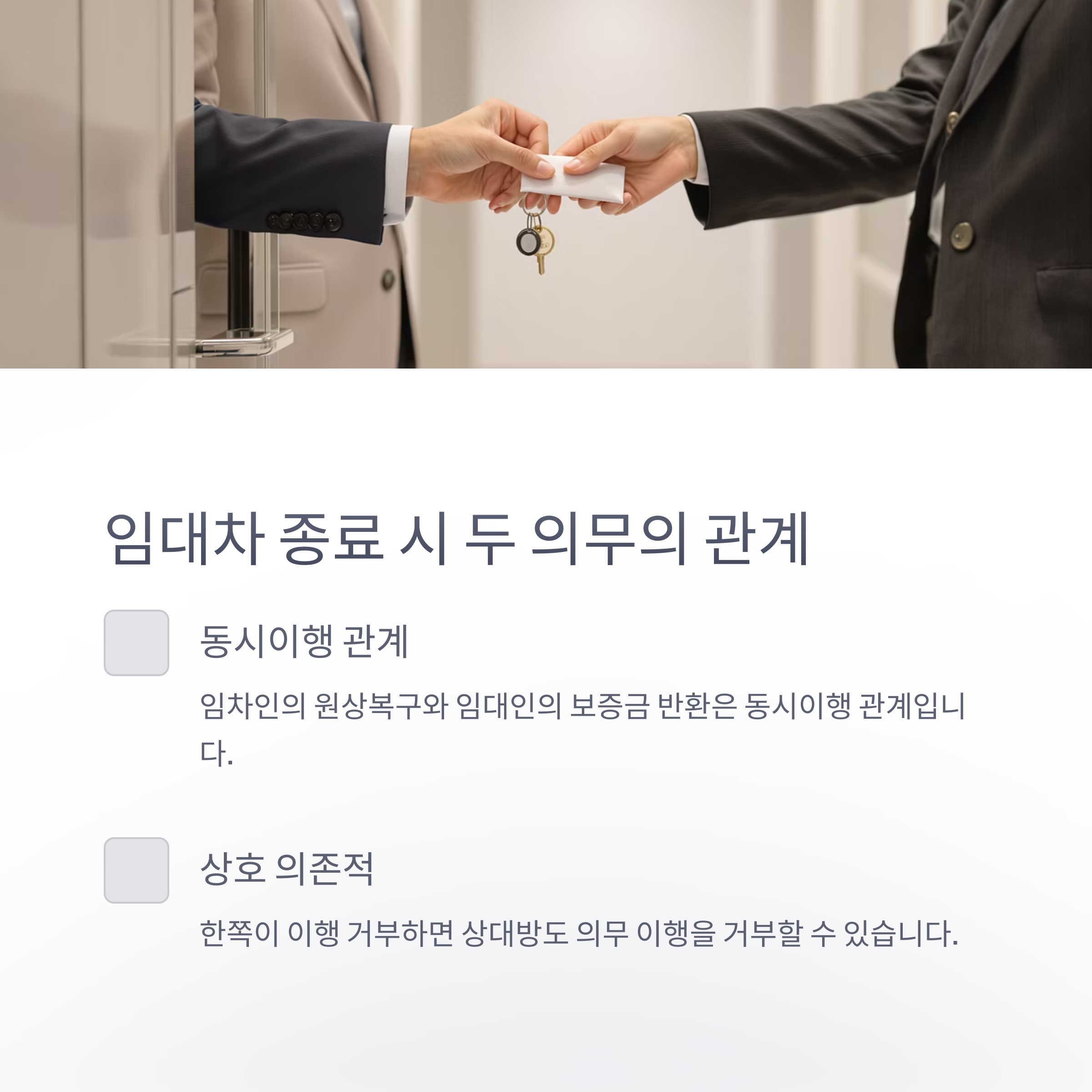 임대차 계약이 종료되면 임차인은 임대인에게 임차목적물을 반환해야 하며, 이때 원상복구 의무를 부담합니다. 동시에 임대인은 임차인에게 보증금을 반환해야 할 의무가 있습니다. 이 두 의무는 동시이행의 관계에 있으며, 한쪽이 이행을 거부하거나 지체할 경우 상대방도 의무 이행을 거부할 수 있습니다.