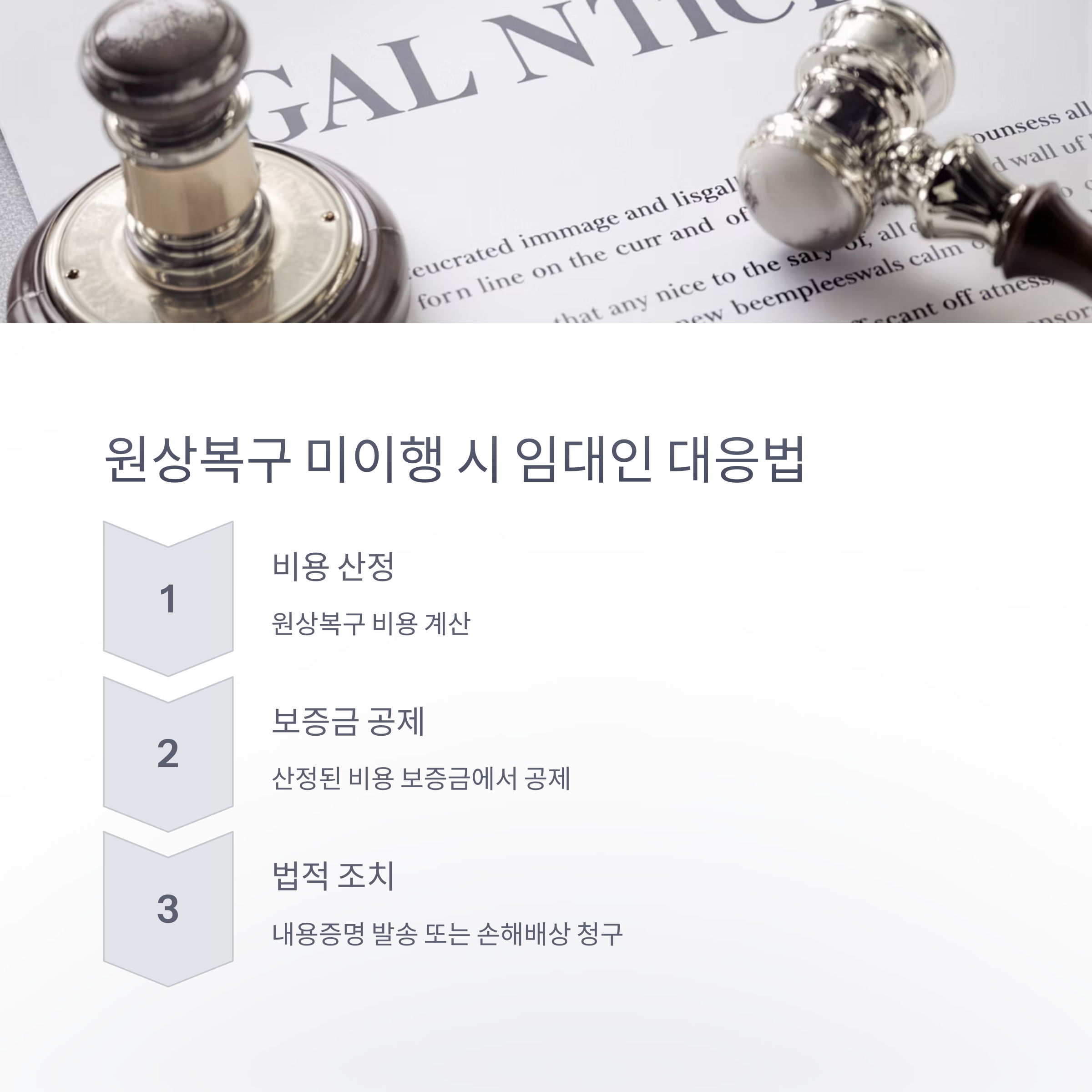 임차인이 원상복구를 완료하지 않은 경우, 임대인은 해당 비용을 산정하여 보증금에서 공제할 수 있습니다. 또한, 임차인에게 원상복구를 요청하는 내용증명을 발송하거나, 법적 절차를 통해 손해배상을 청구할 수 있습니다. 그러나 이러한 조치는 임차인의 원상복구 의무 범위를 초과하지 않아야 하며, 법적 근거에 따라 이루어져야 합니다.
