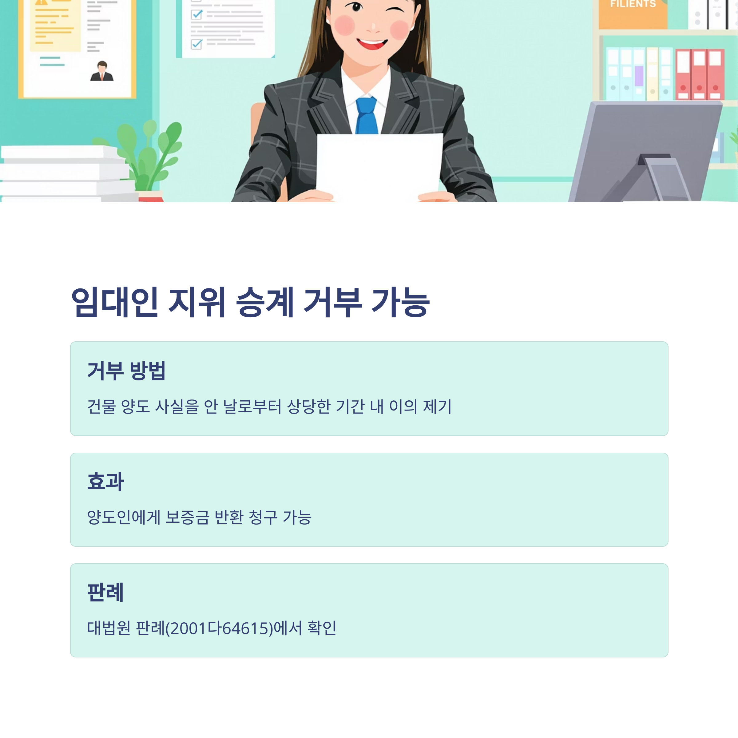 임차인은 상가건물의 양수인이 임대인의 지위를 승계하는 것을 원하지 않을 경우, 건물 양도 사실을 안 날로부터 상당한 기간 내에 이의를 제기함으로써 기존 임대인인 양도인에게 보증금 반환을 청구할 수 있습니다. 이는 대법원 판례(2002.9.4. 선고 2001다64615 판결)에서 확인할 수 있습니다.