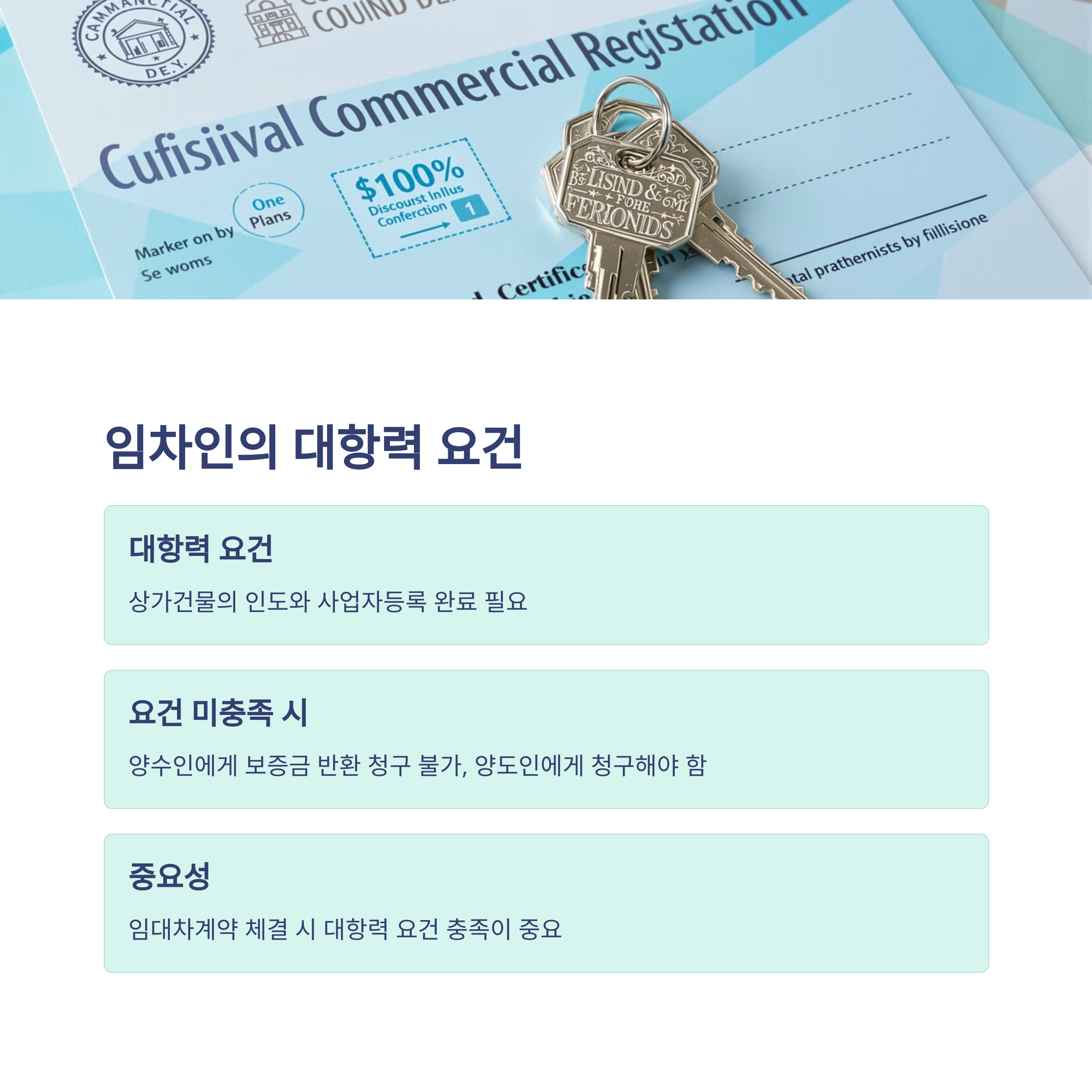 임차인이 대항력을 갖추기 위해서는 상가건물의 인도와 사업자등록을 완료해야 합니다. 이러한 요건을 충족하지 못한 경우, 양수인에게 임대차보증금 반환을 청구할 수 없으며, 기존 임대인인 양도인에게 청구해야 할 수 있습니다.