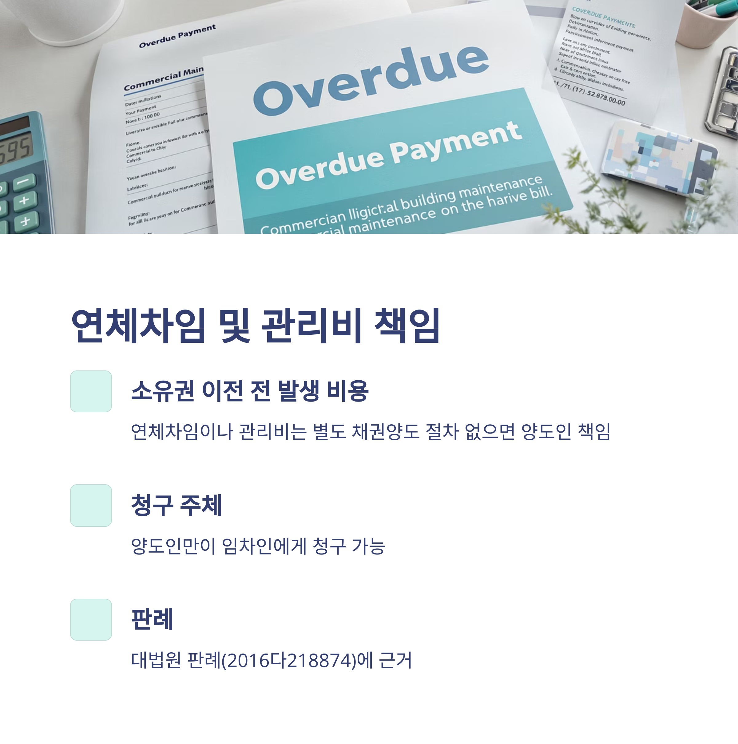 상가건물의 소유권이 이전되기 전에 발생한 연체차임이나 관리비 등은 별도의 채권양도 절차가 없는 한 양수인에게 이전되지 않으며, 기존 임대인인 양도인만이 임차인에게 청구할 수 있습니다. 이는 대법원 판례(2017.3.22. 선고 2016다218874 판결)에 근거합니다.