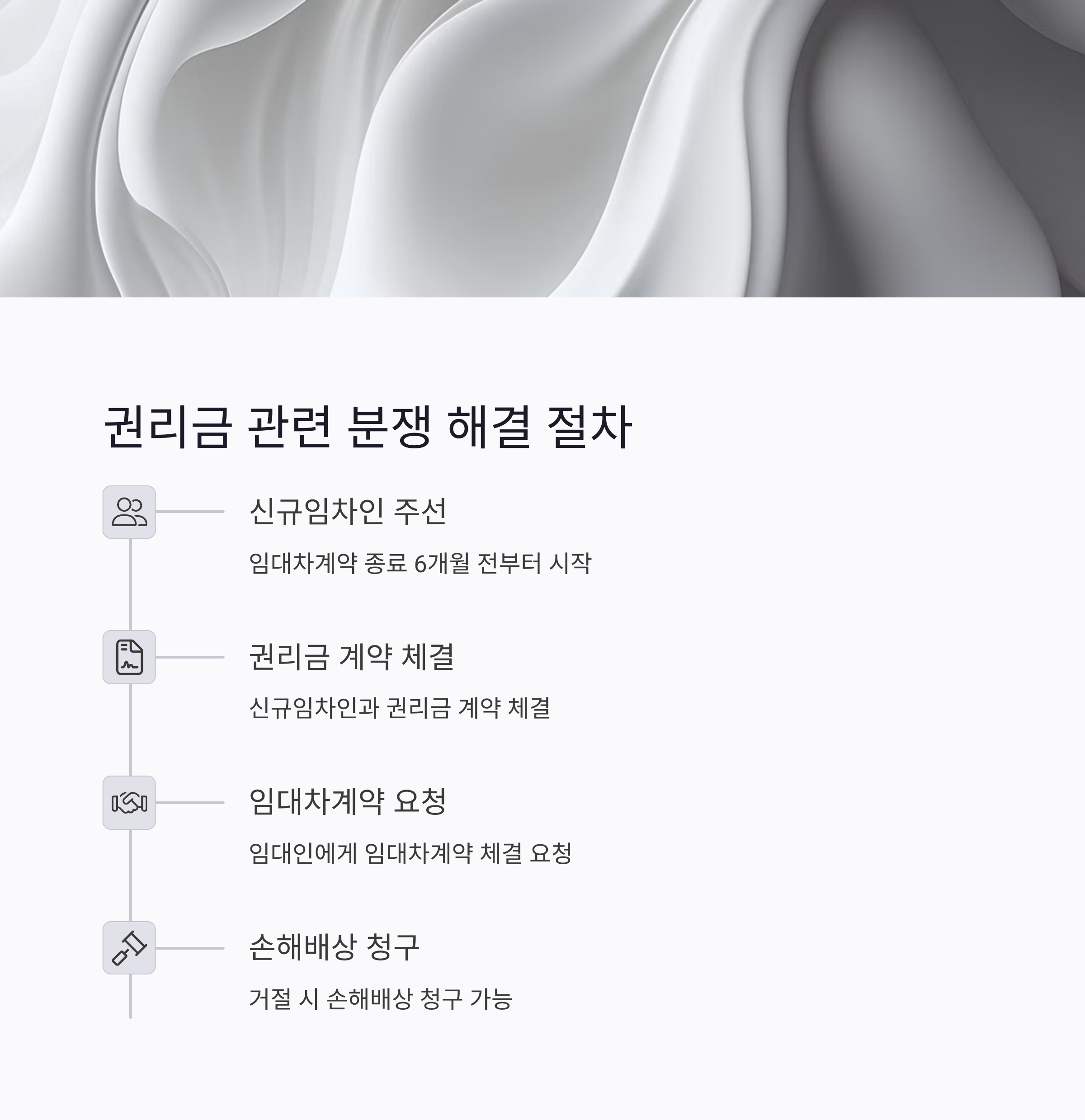 임차인은 임대차계약 종료 6개월 전부터 신규임차인을 주선하여 권리금 계약을 체결하고, 임대인에게 임대차계약 체결을 요청하는 것이 중요합니다. 임대인이 정당한 사유 없이 이를 거절할 경우, 손해배상을 청구할 수 있습니다. 또한, 권리금 계약은 임대차계약과 별도의 계약이므로, 계약서 작성 시 권리금 계약의 내용을 명확히 기재하는 것이 필요합니다.