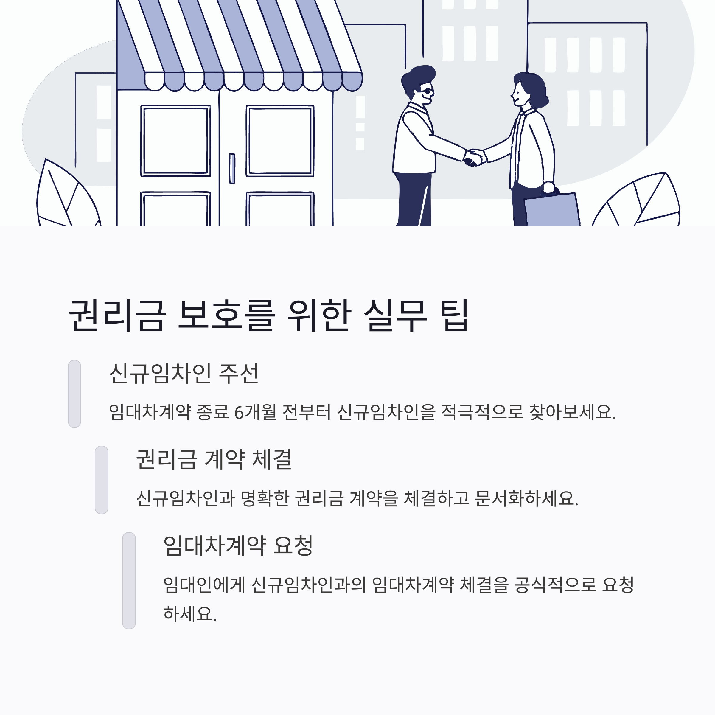 임차인이 권리금 회수기회를 보호받기 위해서는 다음과 같은 절차를 따르는 것이 중요합니다: