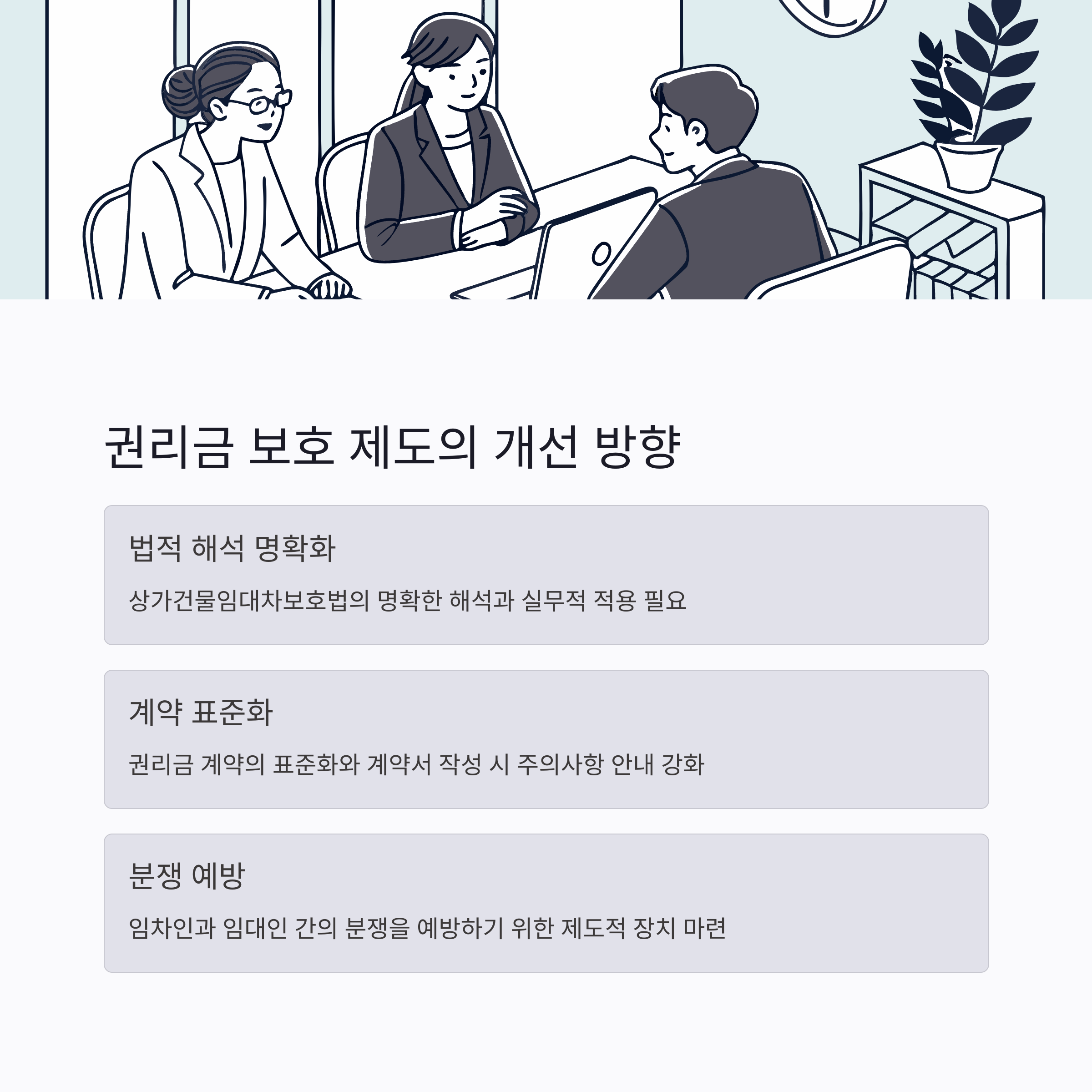 상가건물임대차보호법은 임차인의 권리금 회수기회를 보호하기 위해 다양한 규정을 마련하고 있습니다. 그러나 실제 분쟁 사례에서는 법적 해석의 차이로 인해 갈등이 발생할 수 있으므로, 관련 법령의 명확한 해석과 실무적 적용이 필요합니다. 또한, 임차인과 임대인 간의 분쟁을 예방하기 위해 권리금 계약의 표준화와 계약서 작성 시 주의사항에 대한 안내가 강화되어야 합니다