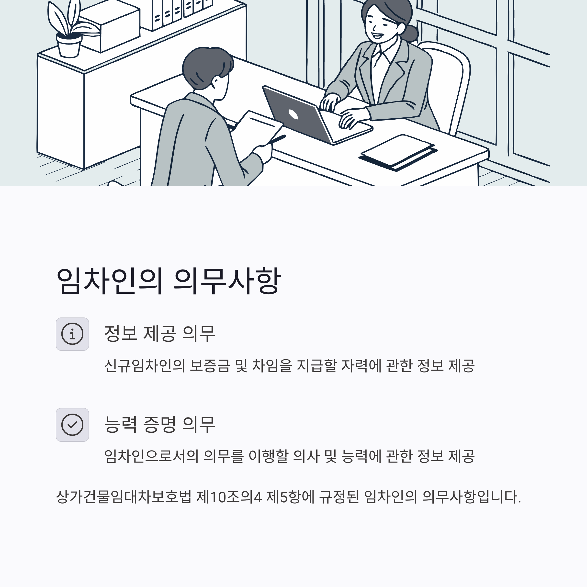임차인은 임대인에게 신규임차인의 보증금 및 차임을 지급할 자력 또는 그 밖에 임차인으로서의 의무를 이행할 의사 및 능력에 관하여 자신이 알고 있는 정보를 제공하여야 합니다. 이는 상가건물임대차보호법 제10조의4 제5항에 규정되어 있습니다.