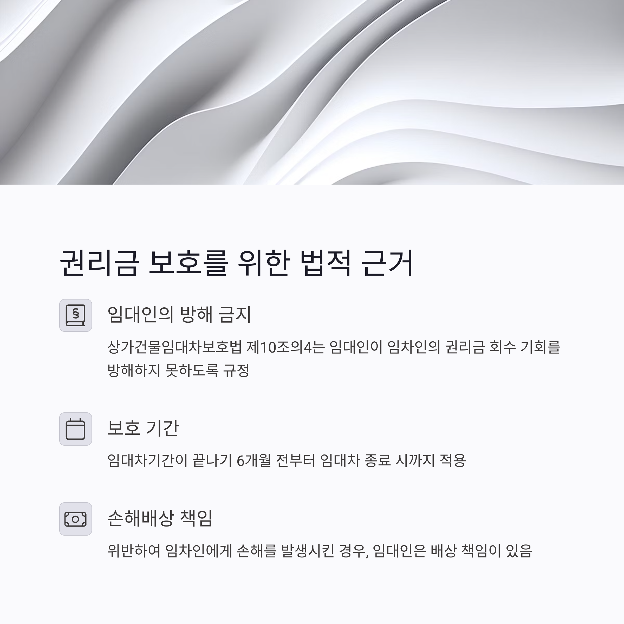 상가건물임대차보호법 제10조의4는 임대인이 임차인의 권리금 회수 기회를 방해하지 못하도록 규정하고 있습니다. 임대차기간이 끝나기 6개월 전부터 임대차 종료 시까지 임대인은 다음과 같은 행위를 해서는 안 됩니다: