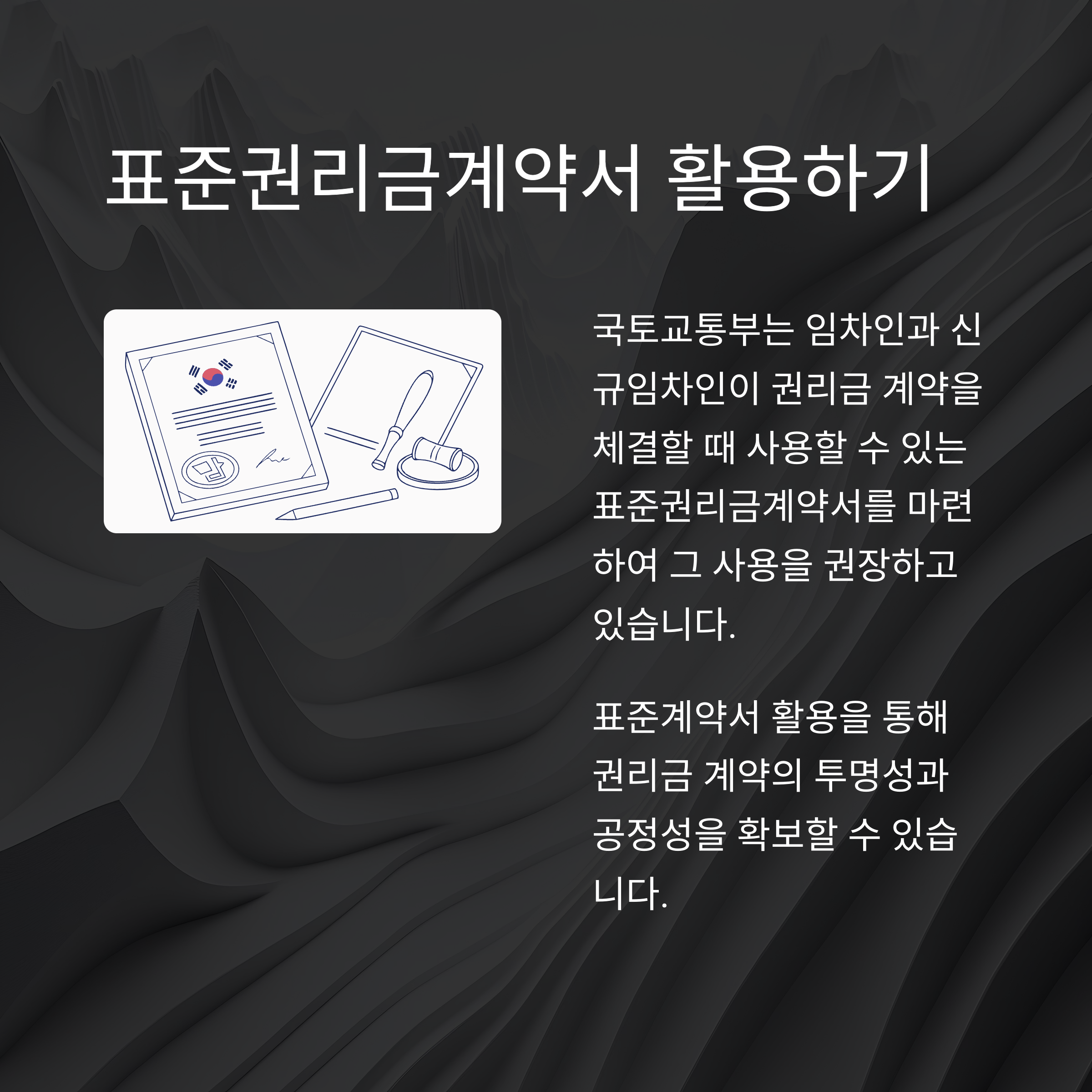 국토교통부는 임차인과 신규임차인이 권리금 계약을 체결할 때 사용할 수 있는 표준권리금계약서를 마련하여 그 사용을 권장하고 있습니다. 이를 통해 권리금 계약의 투명성과 공정성을 확보할 수 있습니다.