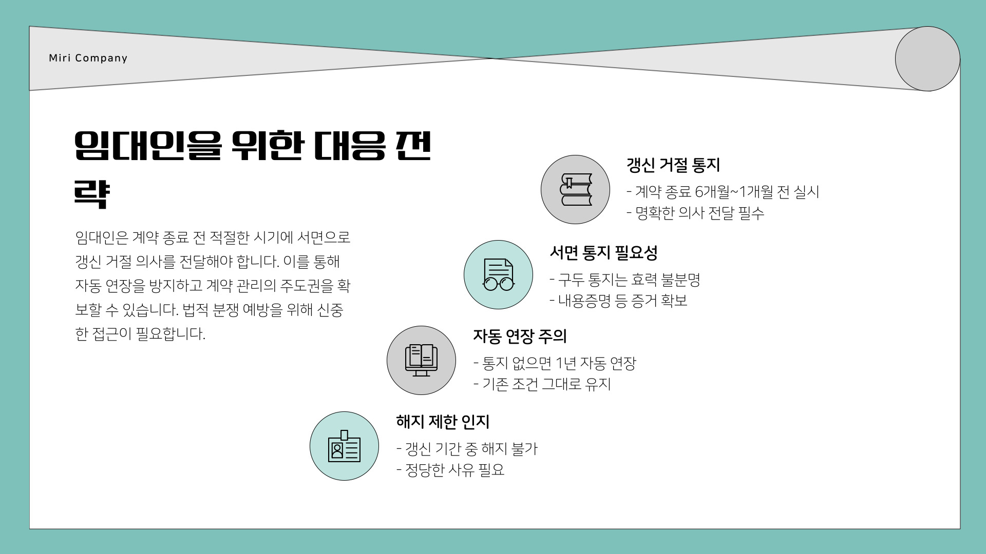 - 계약 종료 전 6개월~1개월 사이에 반드시 서면으로 갱신 거절 통지