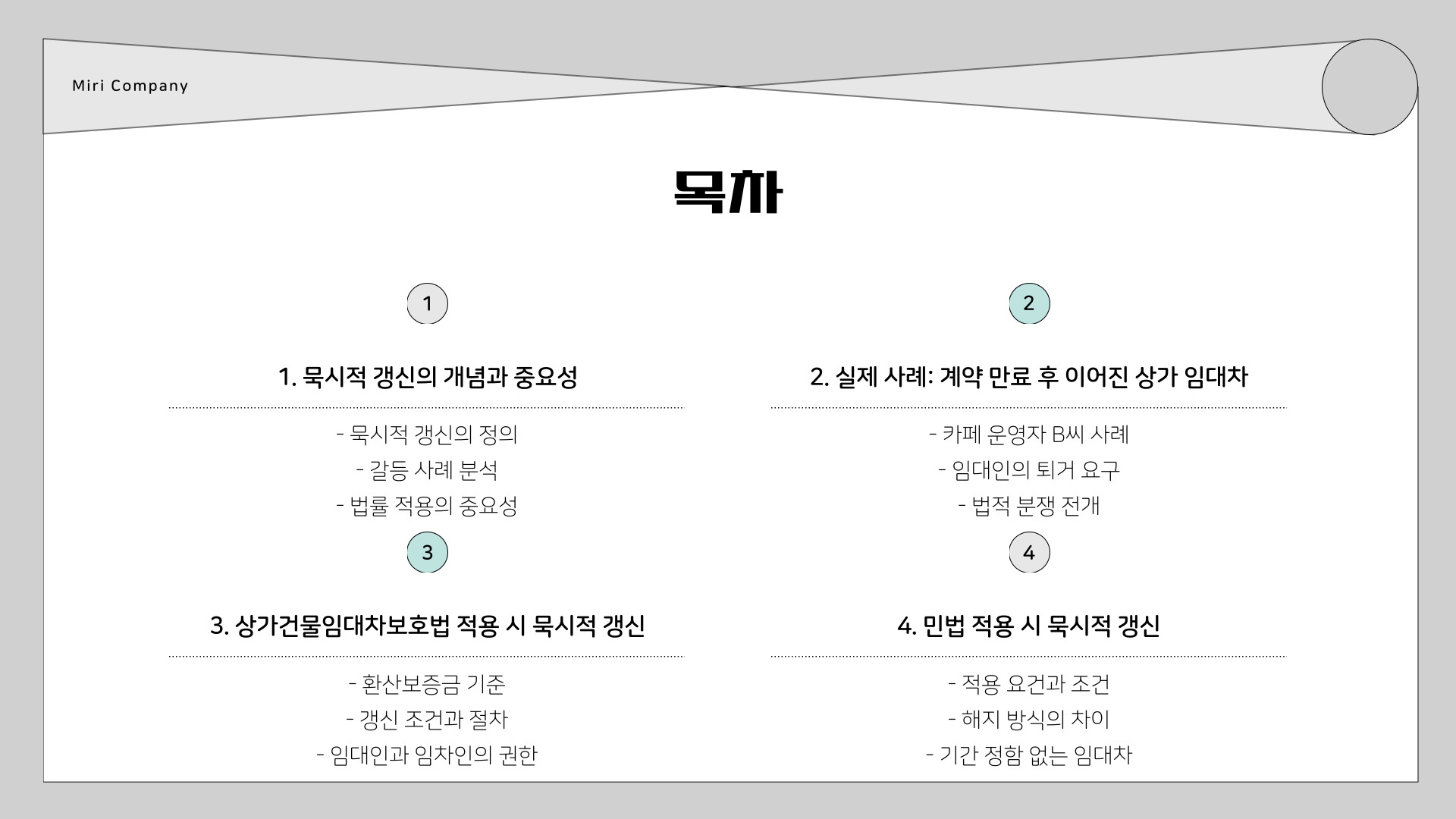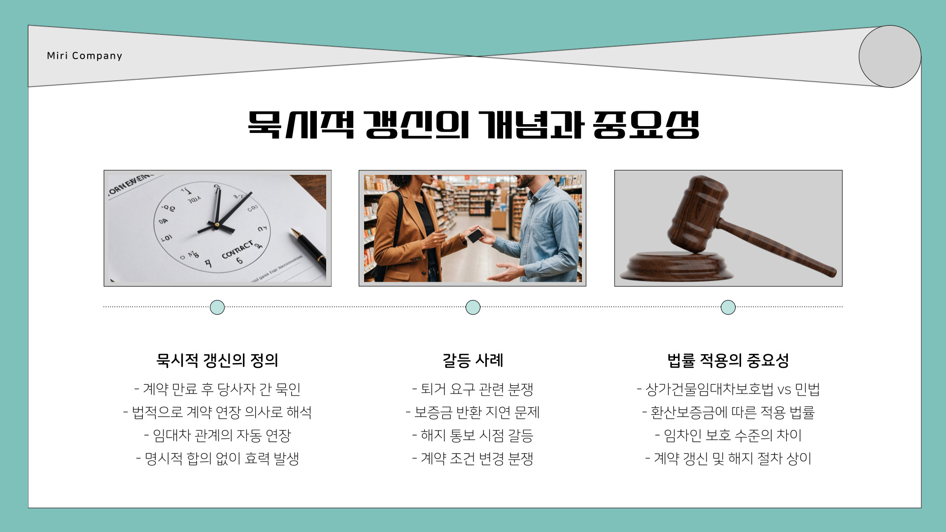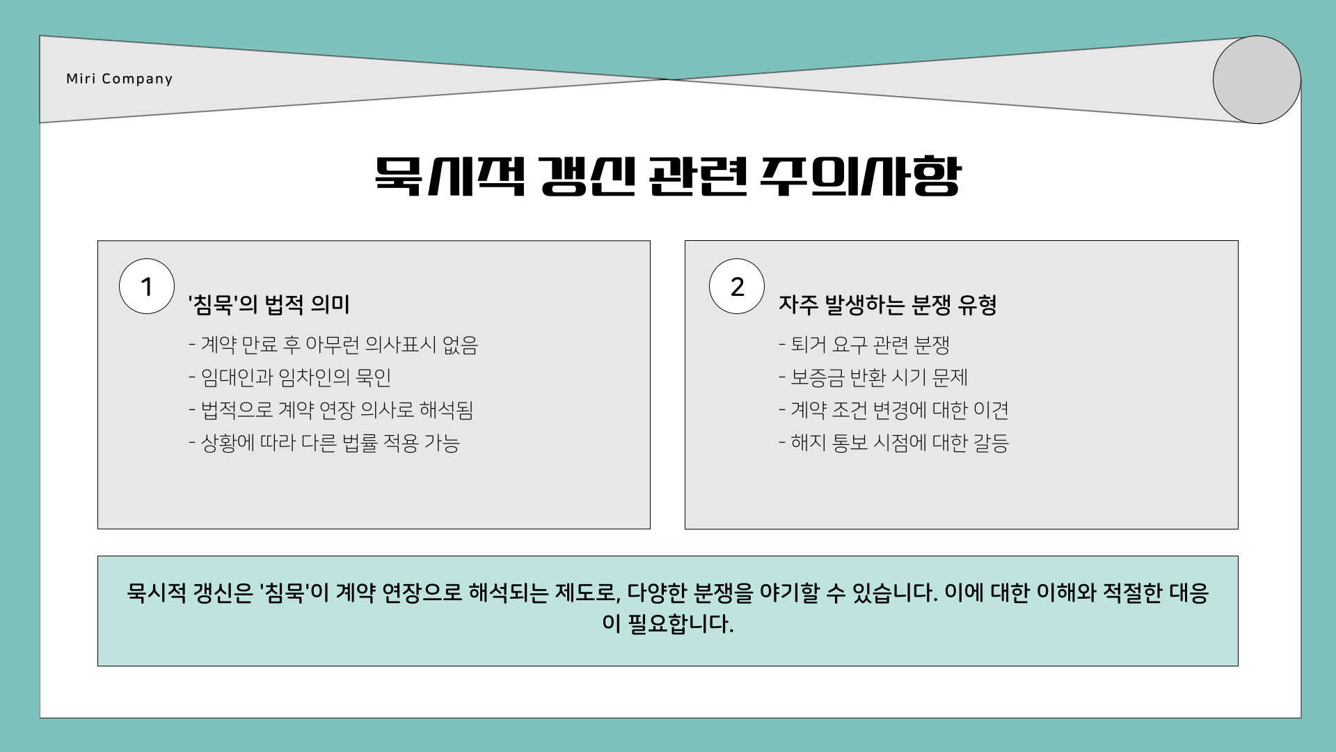 묵시적 갱신은 당사자 간의 ‘묵인’이 법적으로는 계약 연장 의사로 해석되는 제도입니다.