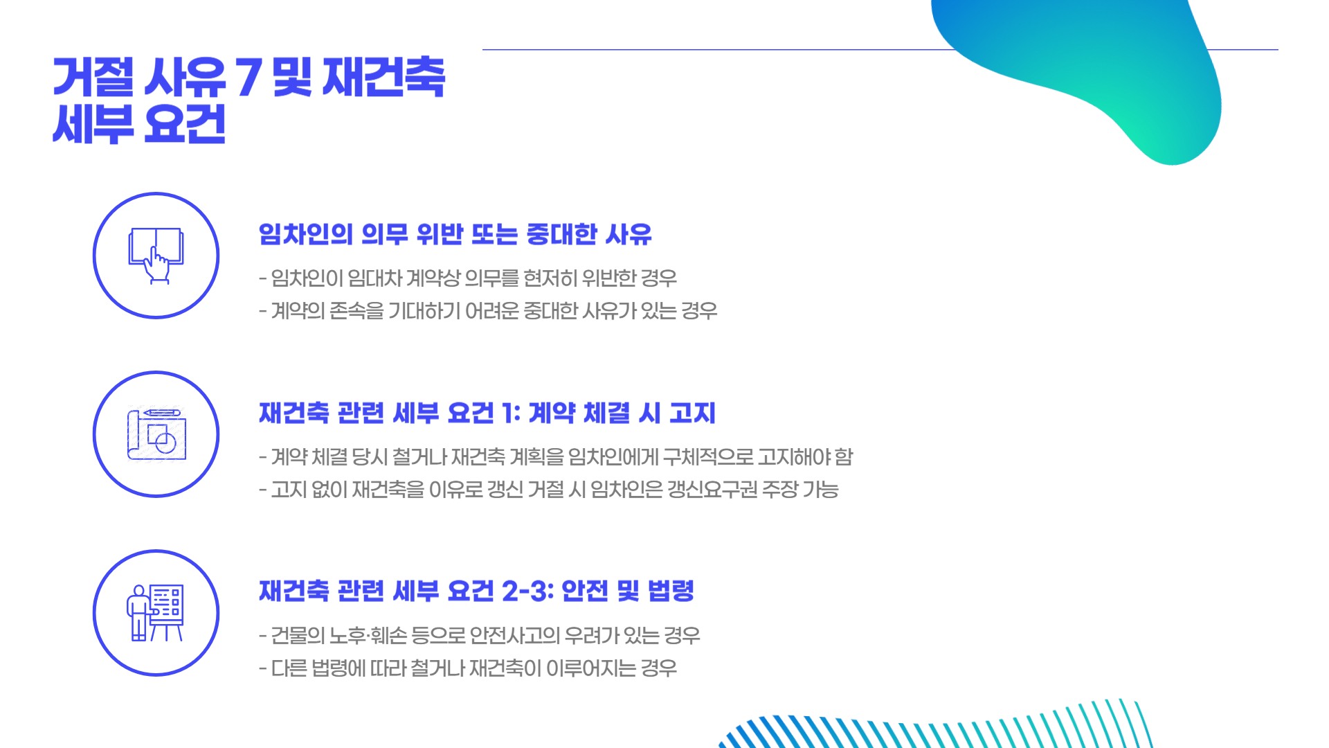 - 재건축 등의 사유로 철거나 점유 회복이 불가피한 경우로, 아래 요건을 충족해야 합니다: