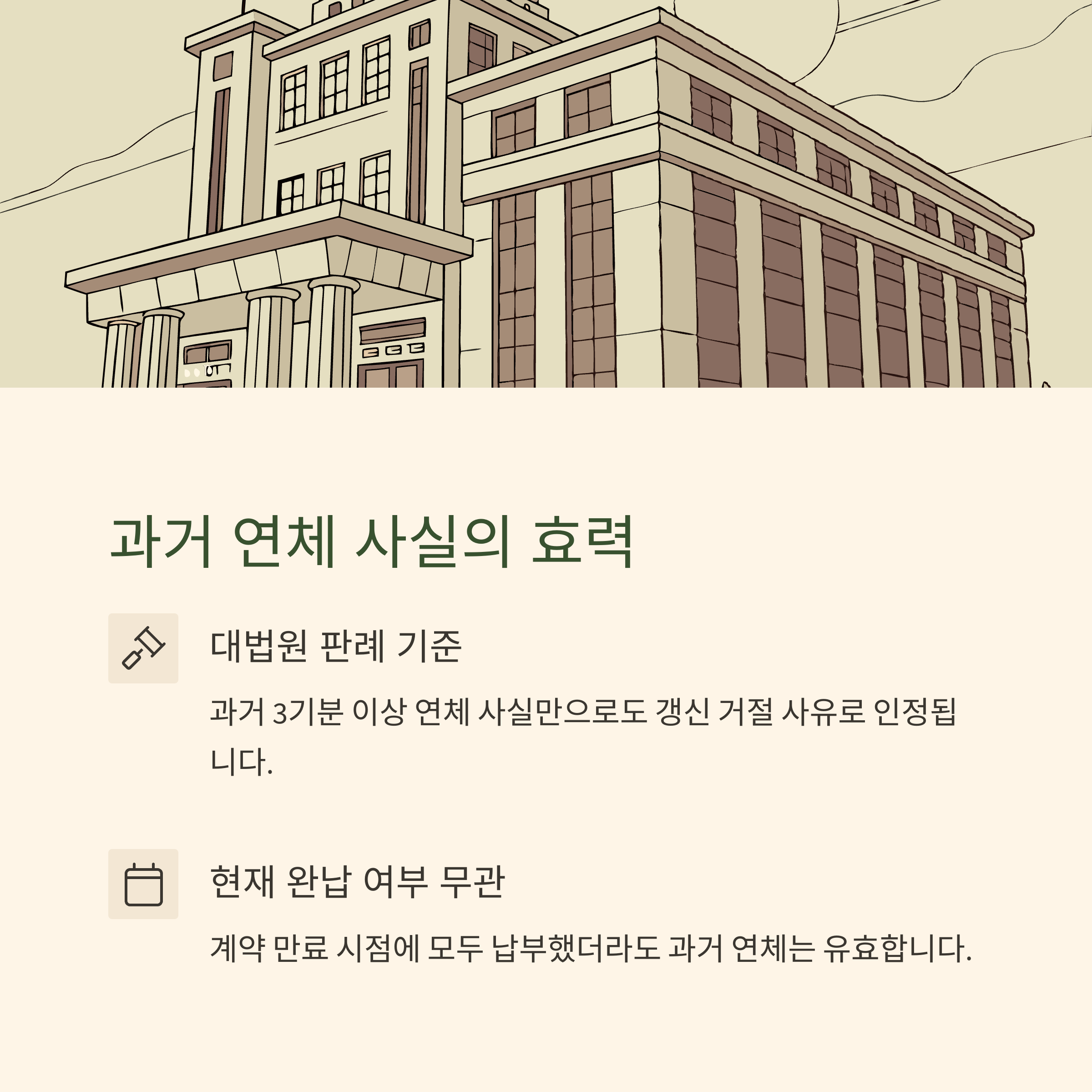 - 연체가 현재 해결되었더라도 과거 사실이 존재하면 갱신 거절이 가능합니다.