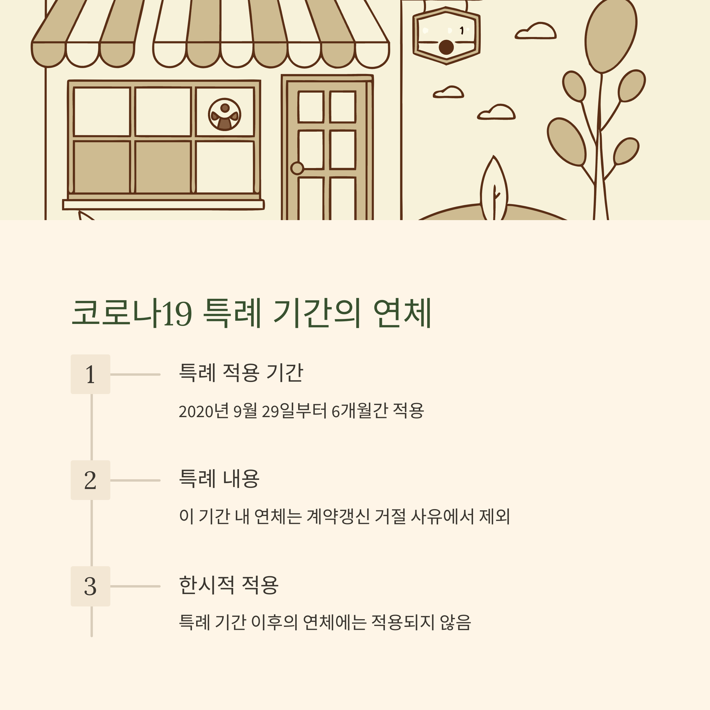 2020년 9월 29일부터 6개월간은 코로나19로 인한 경제적 사정을 고려해 연체 차임에 대한 특례가 적용되었습니다.
