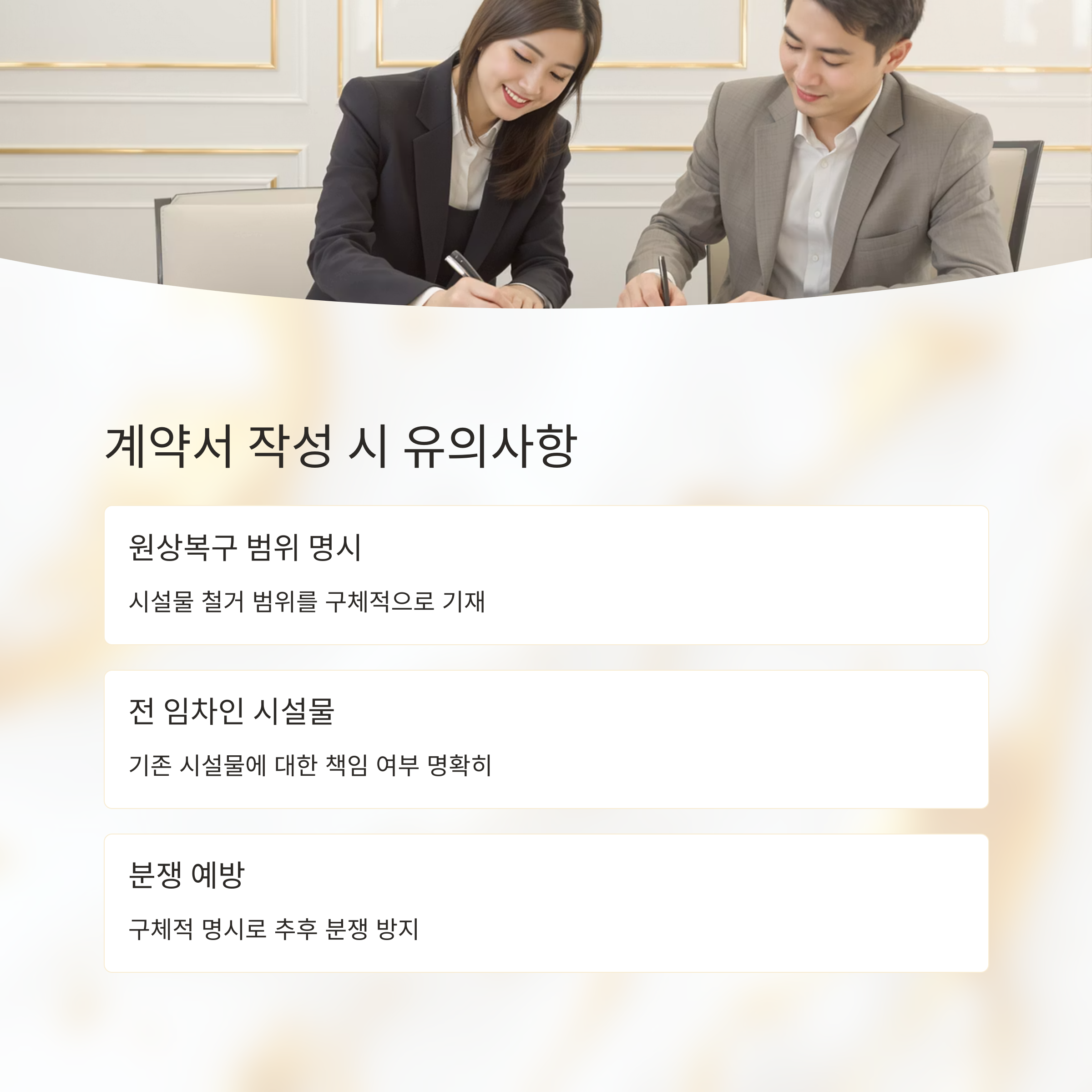 임대차 계약서 작성 시 원상복구 의무의 범위를 명확히 기재하는 것이 중요하다. 특히, 임차인이 설치한 시설물의 철거 범위와 전 임차인의 시설물에 대한 책임 여부를 구체적으로 명시해야 분쟁을 예방할 수 있다.
