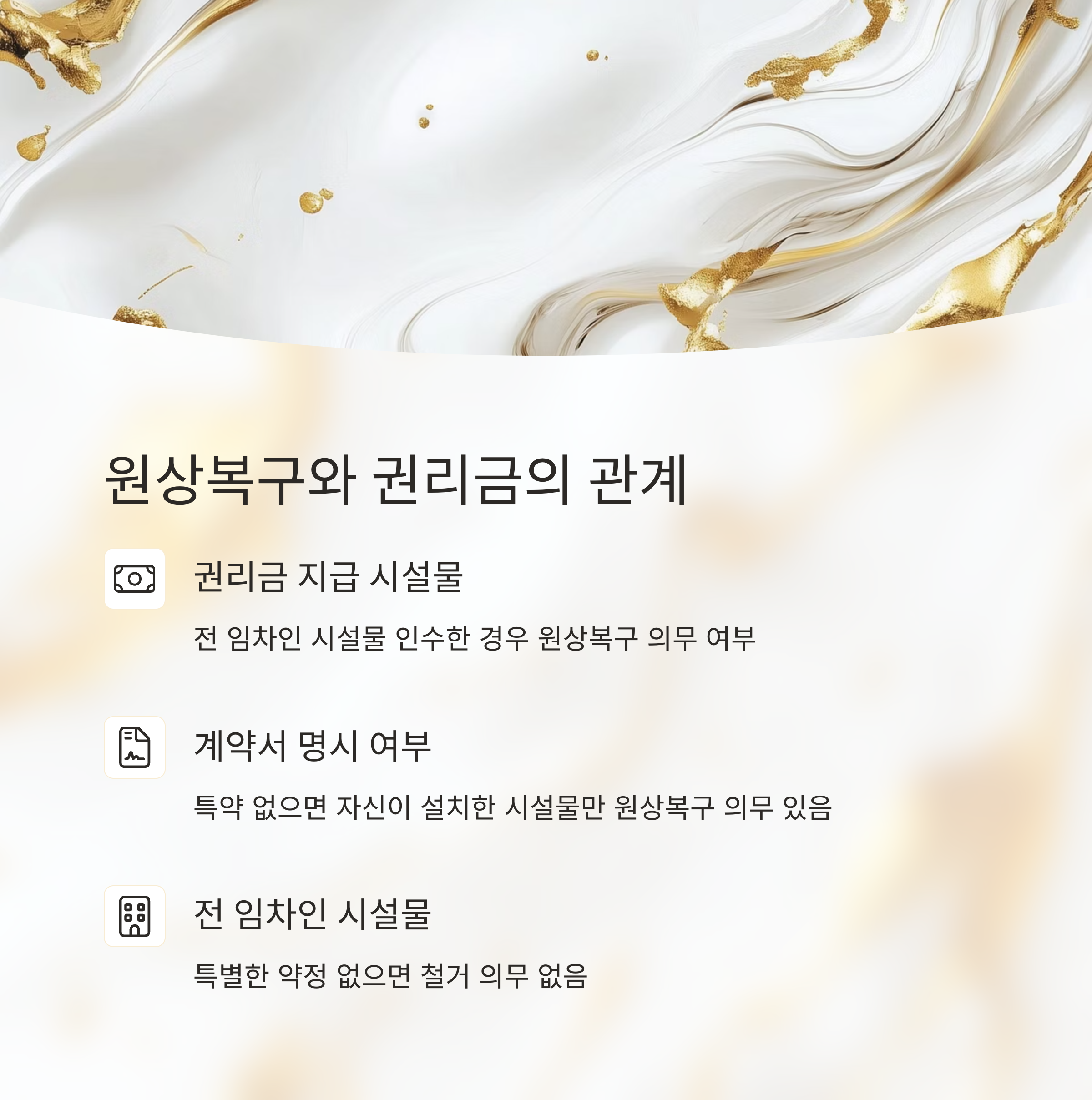 임차인이 권리금을 지급하고 전 임차인의 시설물을 인수한 경우, 해당 시설물에 대한 원상복구 의무가 임차인에게 있는지 여부는 계약서의 명시 여부에 따라 달라진다. 특약이 없는 경우, 임차인은 자신이 설치한 시설물에 대해서만 원상복구 의무가 있으며, 전 임차인의 시설물에 대해서는 의무가 없다.