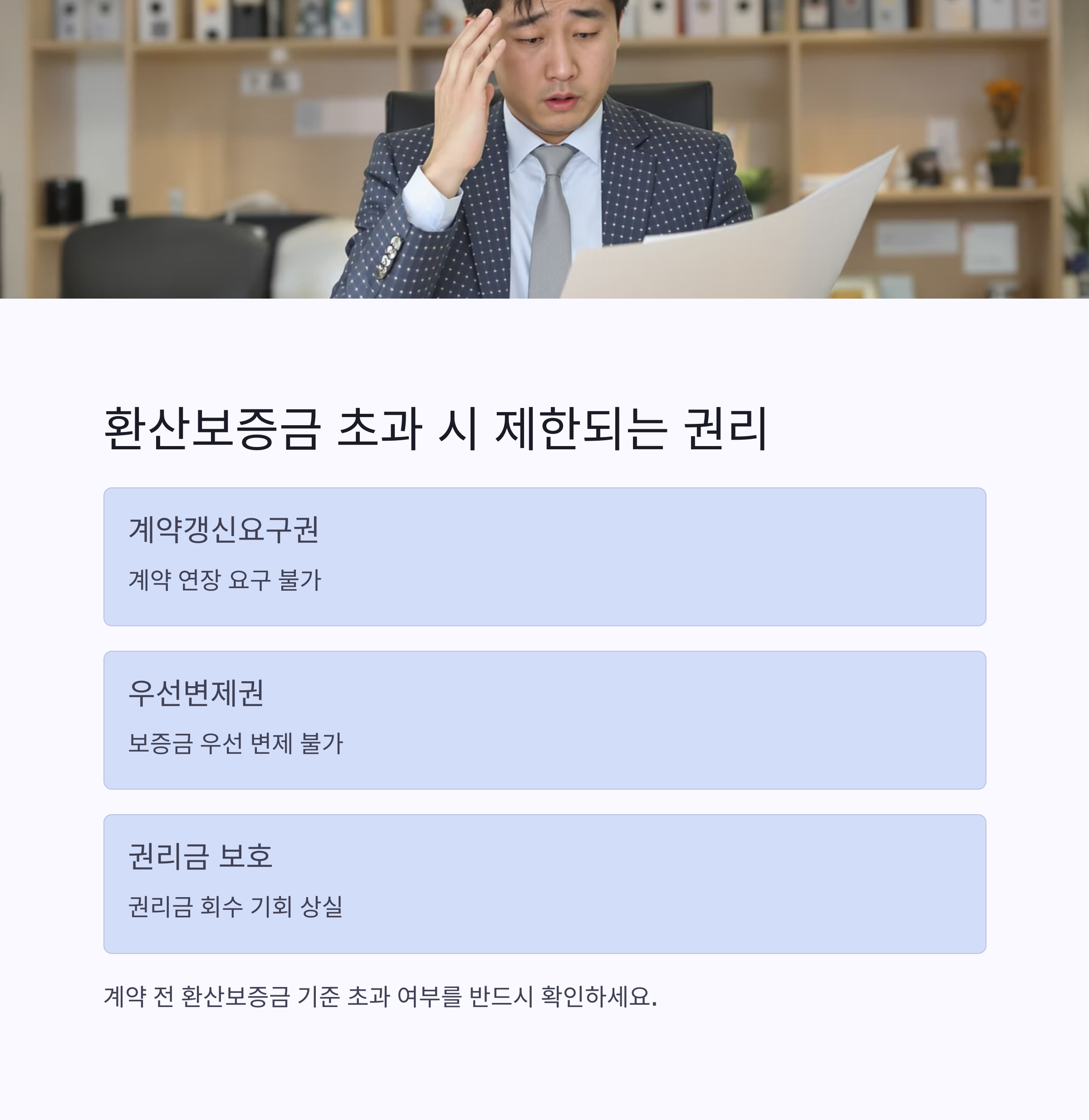 따라서 임차인은 계약 전 환산보증금 기준 초과 여부를 반드시 확인해야 합니다.