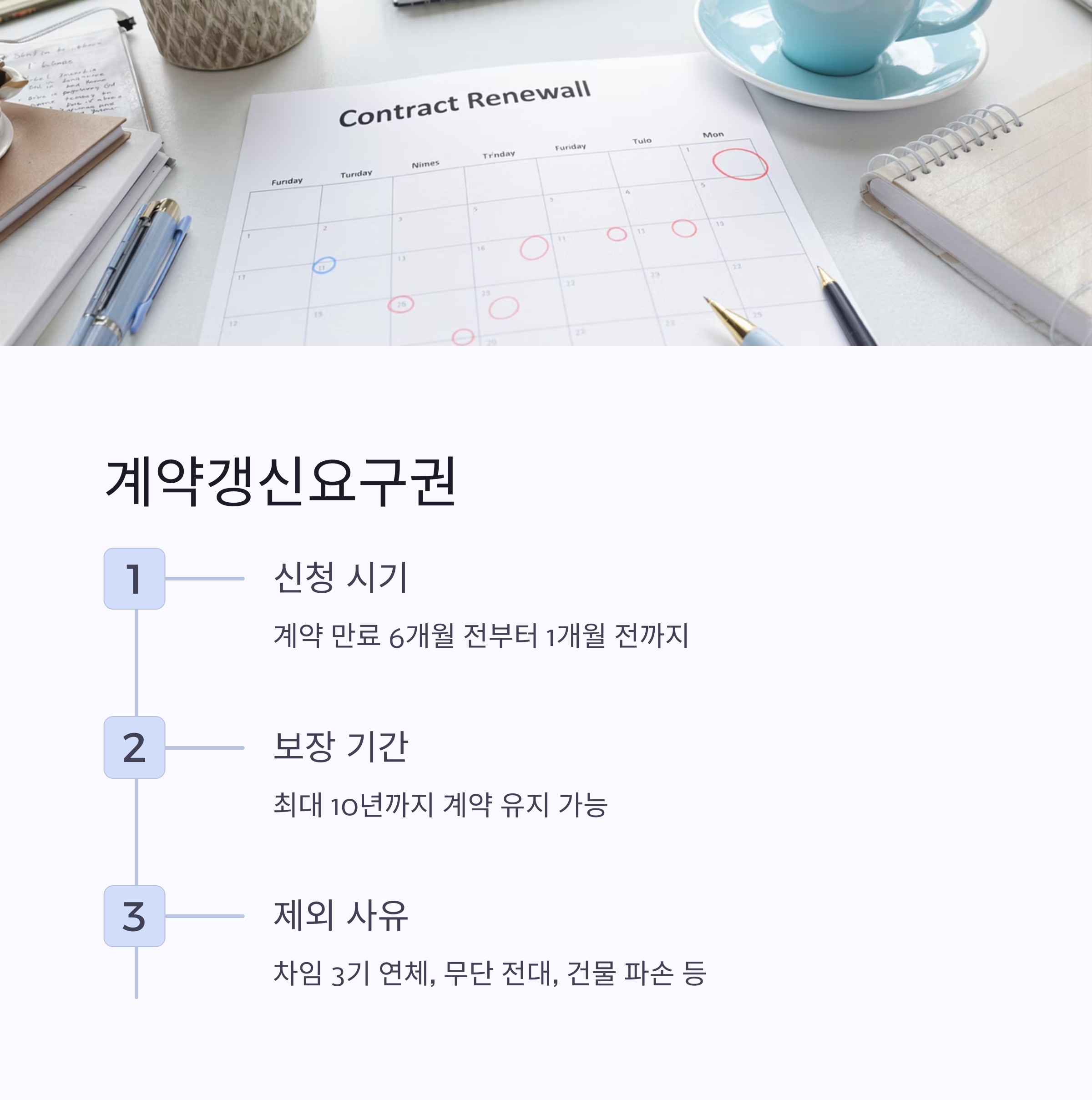 | 계약갱신 조건 | 임차인 권리와 임대인의 거절 사유 포함 |