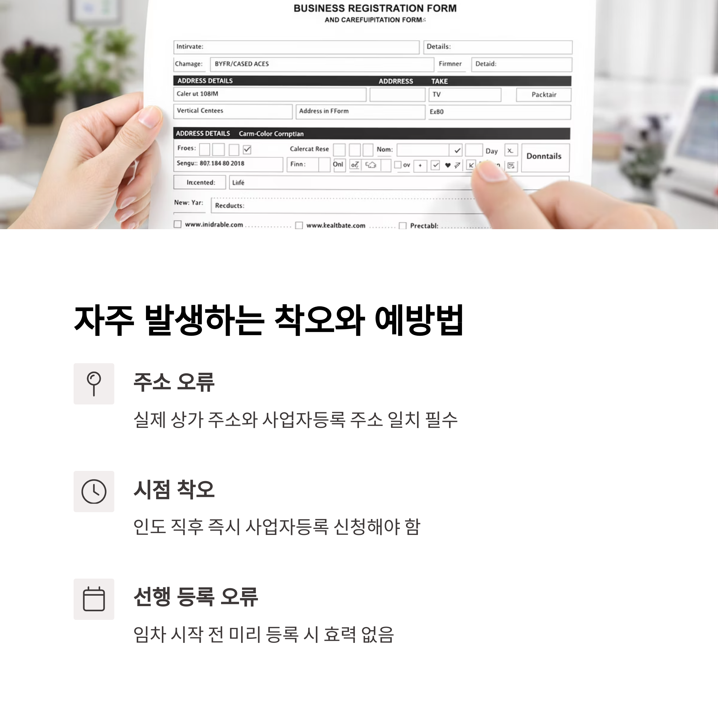 이러한 실수를 방지하기 위해서는 계약 직후 즉시 건물 인도와 동시에 사업자등록을 신청해야 하며,